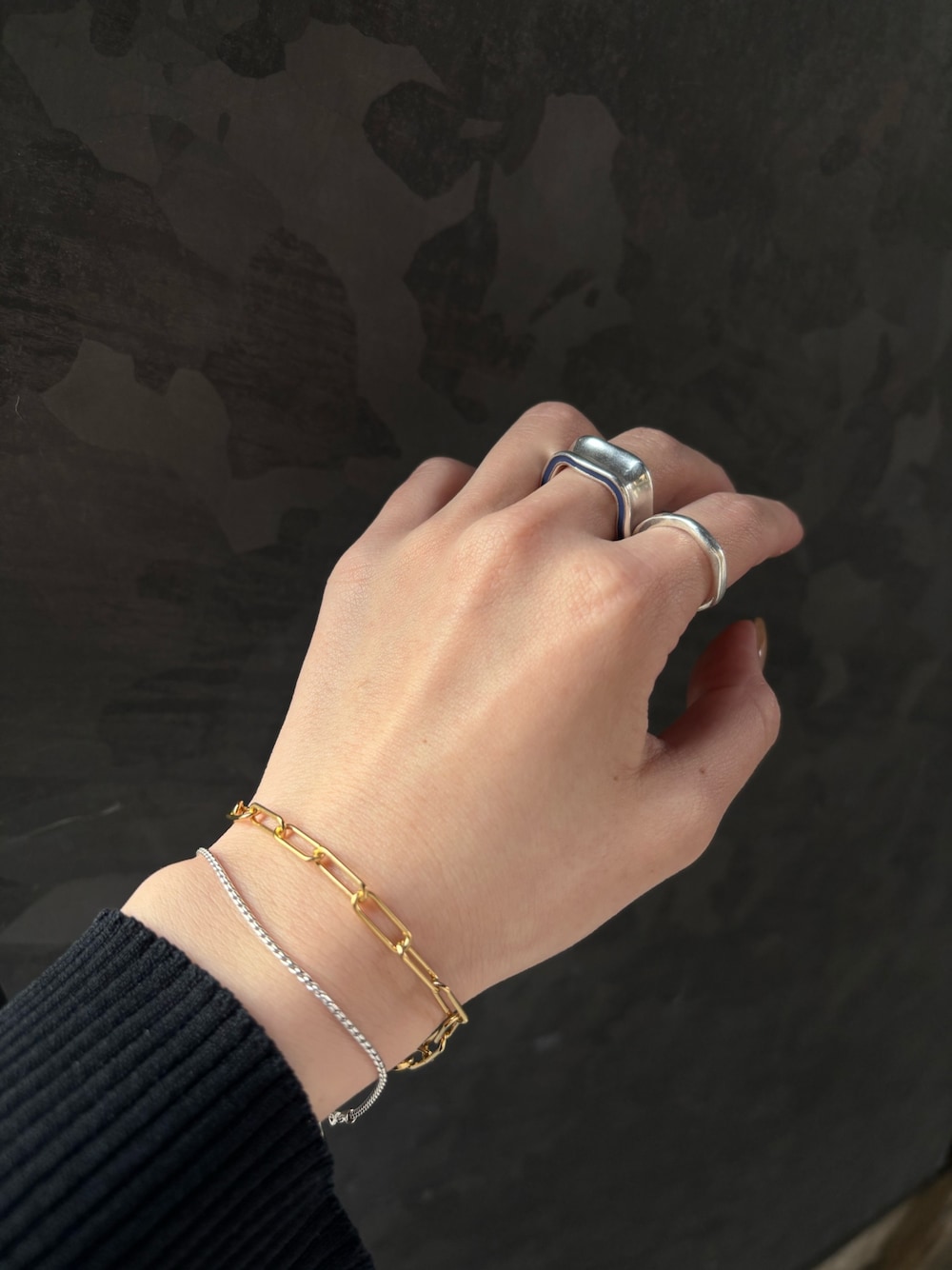 ツイストチェーンブレスレットにレクトチェーンブレスレットのボリューム感違いのブレスレットを重ね付けで抜け感を出すのがおすすめです✨