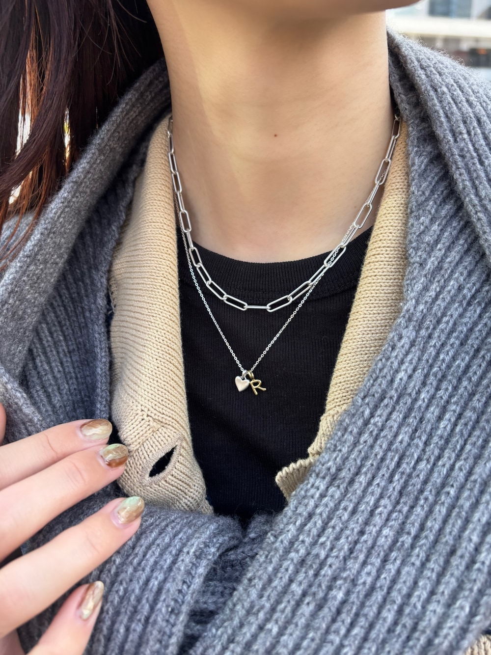 アクセサリーを重ねて、ほどよいボリューム感を出してみました! ベースはシルバーでまとめつつ、チャームにポイントでゴールドを入れてアクセントにしています♪