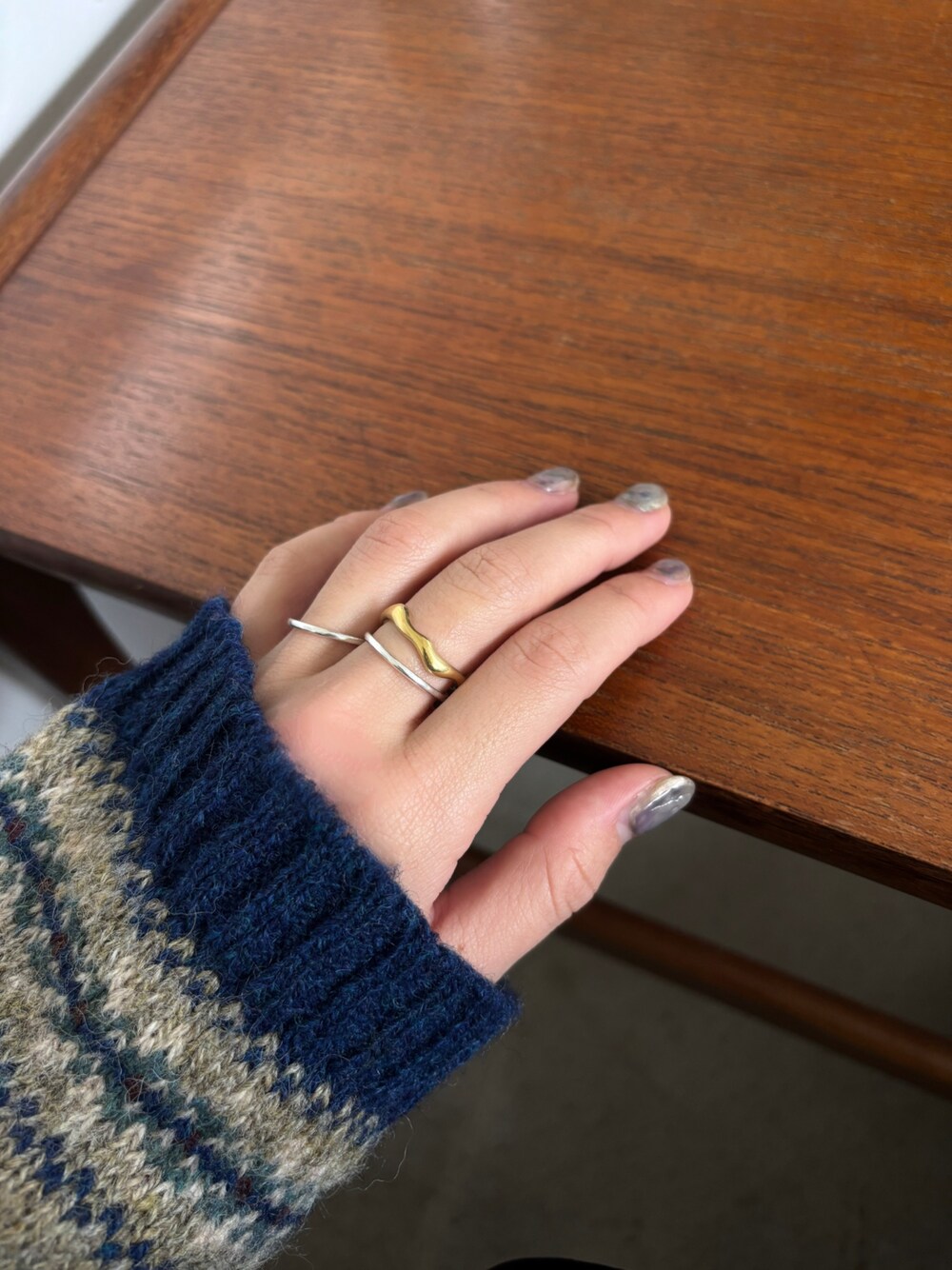 ラインリングはサイズ違いのセットで、 私は01(9号・11号)を重ね着けしています! シルバーのラインリングに、ゴールドのリップルリングを合わせることで、程よい抜け感をプラスしました✨