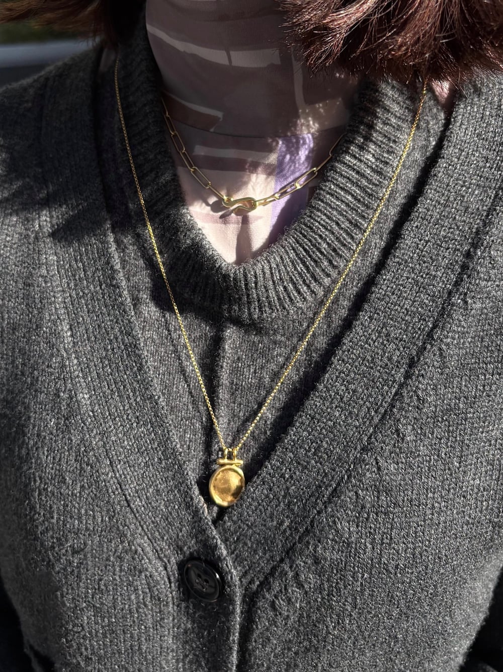 レクトチェーンネックレスにシェルフネックレスをレイヤード✨ ゴールド同士の組み合わせで、首元をすっきりみせてくれます! ・レクトチェーンネックレス:全長40cm ・シェルフネックレス:全長60cm(2段階調整/55cm・60cm) →60cmで着用しております♪