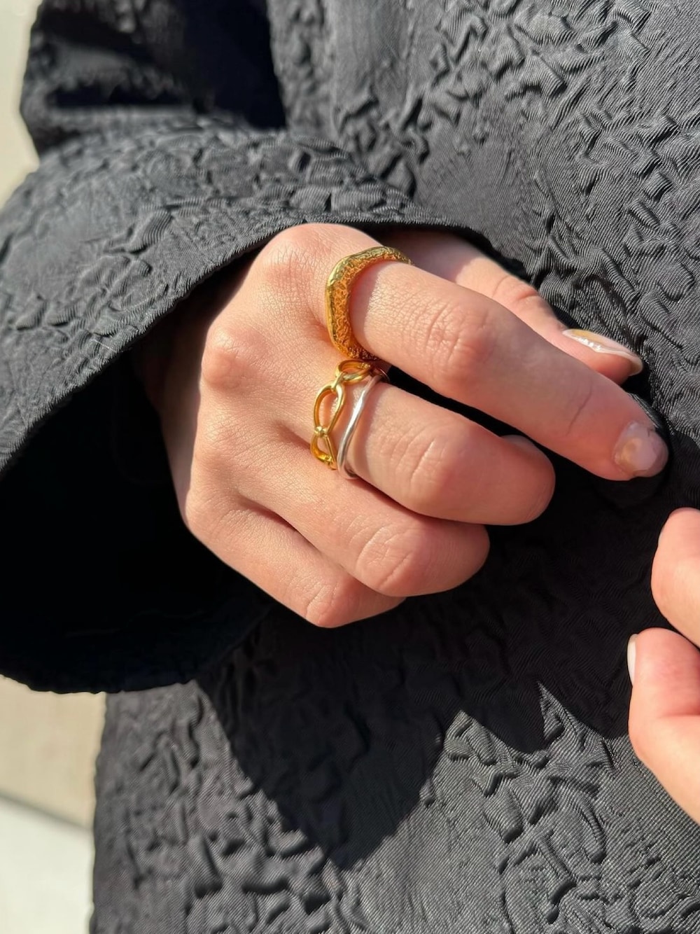 ゴールドをメインに、ポイントでシルバーを取り入れたコーディネート✨ フラックスリングは、TEN.の中でもいちばん細めのリング。 サイズは9号〜22号まであるので、気分で指を変えて楽しめます。私は11号を着けています! さりげなくコーデのアクセントになってくれます♪