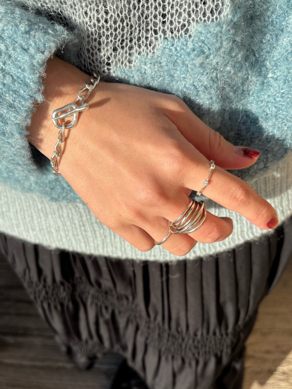 ルーのニットにシルバーアクセサリーを合わせて、手元にしっかりボリュームを出したコーディネート✨ リングは重ね付けで立体感をプラスしました♪ ムードフープブレスレットはS・Mの2サイズ展開で、Sサイズを着用。 オリジナルのマンテルパーツがさりげないポイントになり、きれいめにもカジュアルにも合わせやすいデザインです! 【着用アイテム】 ・ルクスリングSV 11号 ・ビロウリングSV 11号 ・ラインリングSV01(9号と11号のセット/9号のみ着用) ・ムードフープブレスレットSV Sサイズ