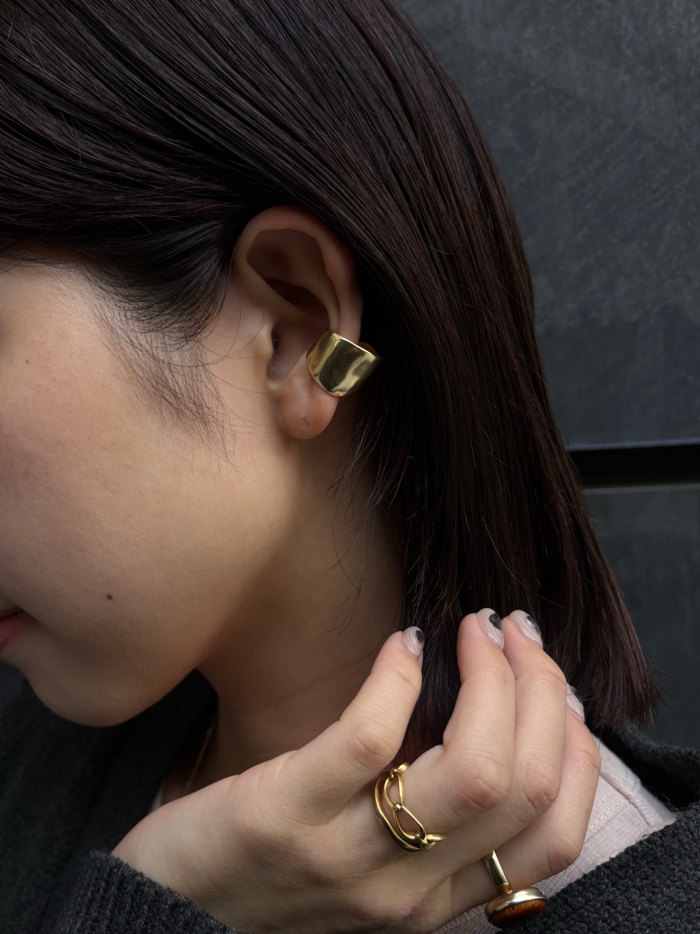 イヤーコンビアンプルリングをイヤーカフとしてコーディネートしてみました✨ 存在感のあるイヤーカフなので、今回はピアスはなしで単体にしてみした♪ 【着用アイテム】 ・イヤーコンビアンプルリング GD ・ニッチリング GD 9号 ・スティムレーションリング GD 9号(サイズ:9〜15号、18・20・22号展開) ・デュンスリング GD-BR 11号