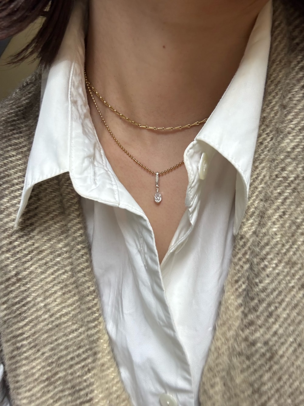 バリーコーンチェーンネックレスは38㎝、ボールチェーンコンビネックレスは40㎝で着用。 チャームを通していることで少しボリューム感が出て、首元に存在感をプラスしてくれます! チェーン自体にもデザイン性があるので、シンプルなコーディネートでも程よいアクセントになります♪ 【着用アイテム】 ・バリーコーンチェーンネックレスGD(38㎝) ・ボールチェーンコンビネックレスGD(40㎝) ・ボライドチャームGD