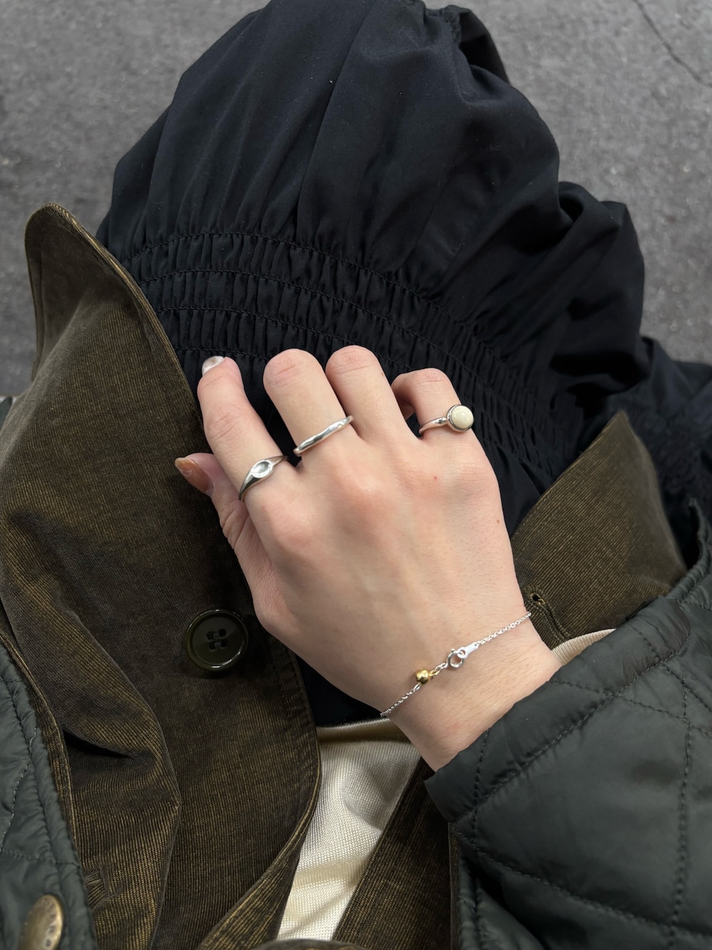 シルバーで統一感を持たせつつ、ブレスレットにはMIXカラーのバロックブレスレットを加えアクセントを効かせました✨ さりげない抜け感が出るので、とてもおすすめです! ほんのり輝きを放ってくれるので、手元にさりげない華やかさがプラスされます♪ 【着用アイテム】 ・アビスリングSV/11号 ・スティムレーションリングSV/11号 ・ピティートリングSV(BE)/3号 ・バロックブレスレットMIX