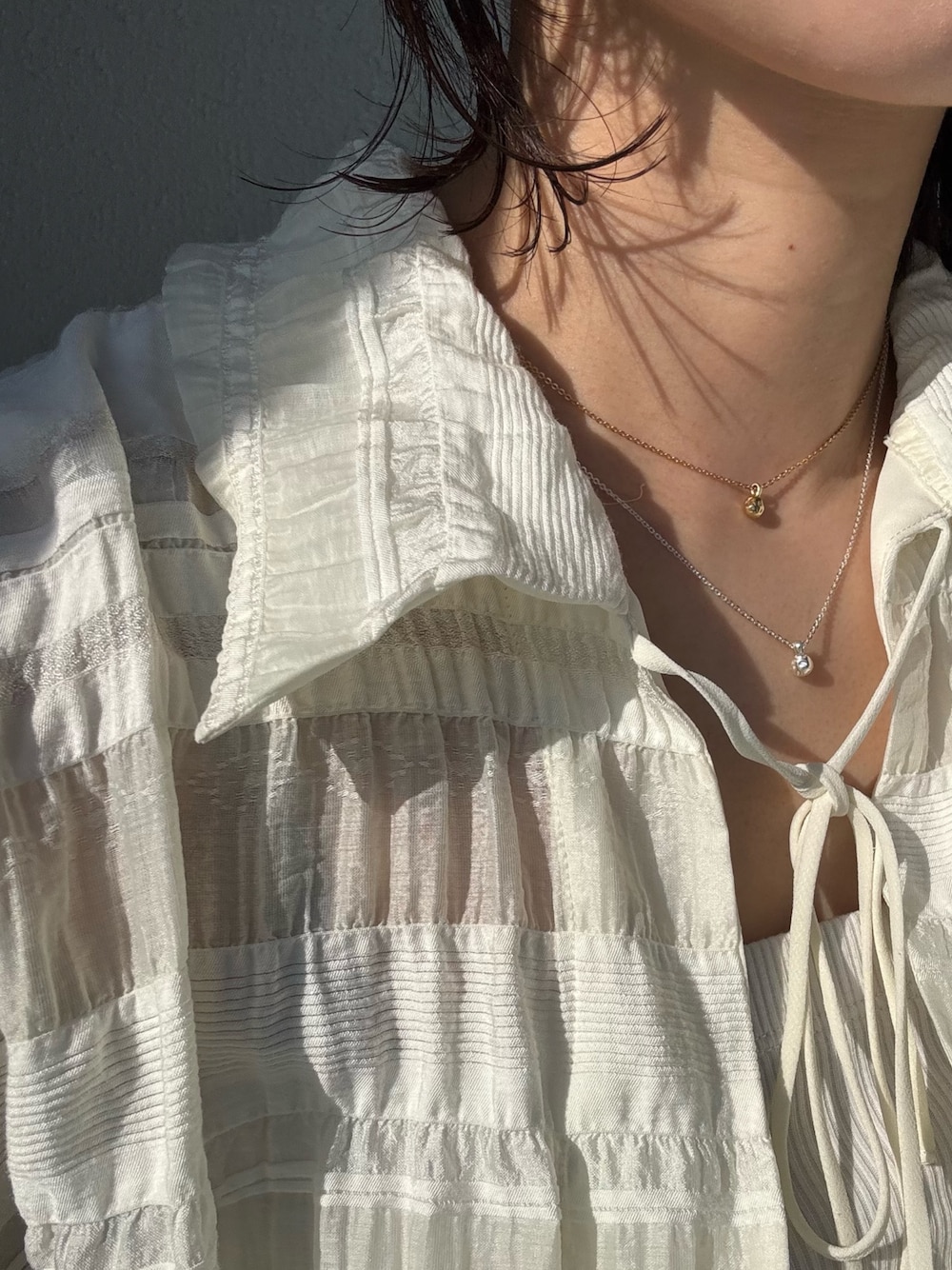 白のシャツにバロックネックレスを重ね付けしてみました✨ バロックネックレスは38/43cmの2段階調整が可能で、ゴールドは38cm、シルバーは43cmで着用しています! シンプルなお洋服のアクセントになり、コーディネートを問わず合わせやすいデザインです♪ さりげない華やかさがあるので、オフィススタイルにもおすすめです!