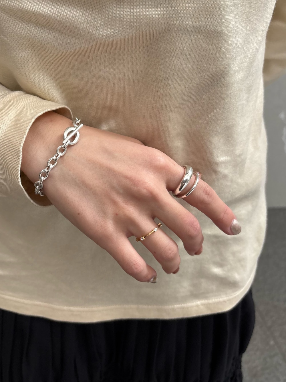 モノブレスレットはS・Mの2サイズ展開で、私はSサイズをつけてます◎ ほどよいボリューム感で、マンテルのデザインがさりげないアクセントになってくれます✨ 【着用アイテム】 ・モノブレスレット Sサイズ ・クロスリングSV / 11号 ・ルクスリングGD / 9号