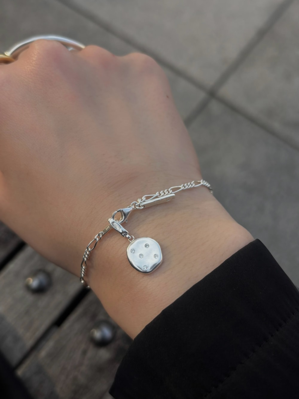 フィガロチェーンブレスレットにポルカチャームを合わせてみました✨ ドット柄のキュービックジルコニアがさりげなくきらっと輝いて、程よいアクセントに◎ 【着用アイテム】 ・フィガロチェーンブレスレットSV(17.5cm) ・ポルカチャームSV