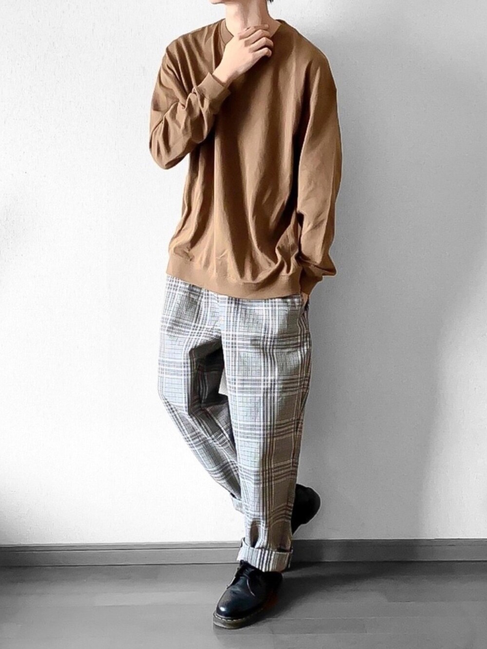 全身GUコーデ No.30『ブラウンセーターを着用した大人のプチプラカジュアルコーデ』 普段Mサイズを着用していますが、 トップスのセーターはあえてLサイズを着用しています。 腕の溜まりがゆる感を増してくれて最高に可愛いので好きです。 流行りのシェフパンツはチェック柄をチョイスしています。 カジュアルすぎてしまうので革靴できれいめ要素をプラスし、きれいめとカジュアルを中和しています。 — item — tops : 「GU」ライトウェイトスウェットプルオーバー(長袖)+E ¥1,490+tax pants : 「GU」シェフパンツ(チェック4) ¥1,490+tax socks : 「GU」ベリーショートソックス3P ¥590+tax shoes : 「Dr.Martens」¥23,100 watch : 「agnes b.」¥27,000 — color & size — tops : 36 BROWN (L) pants : 82 82 (L) socks : 90 90 (25〜27) — SNS — Instagram → @baschee106 WEAR → @io9608ri