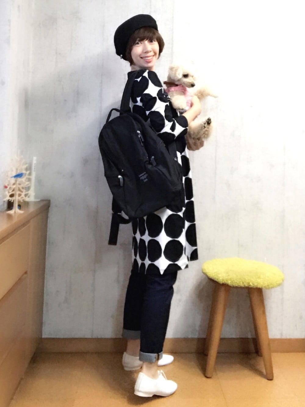 こんにちは! 昨日の台風は大丈夫でしたか? 我が家では夜中にマンションの火災警報器が鳴って、 消防車は来るわ、住人同士でザワザワするわで、ダブルでてんやわんやでした! 結局、何事もなくホッとしました。 チャコもこの騒ぎにちょっと心配そうなお顔。 自分のベッドにかじりついていたので、横に居ました。 こんな小さな体で体感する暴風雨の音は人よりも大きく、恐怖に思うんだろうなぁ。 今日は寒過ぎず、暑過ぎず、ちょうどいい季節のコーデです。 ワンピースにデニム履いちゃう。 この夏、UNIQLOとコラボした時のドット柄、 マリメッコオリジナルバージョンは若干●が大きめなのかな? 久しぶりにクラウンのジャズダンスシューズ合わせ。 秋晴れの空のように、ハッピーな一日をお過ごしくださいね🌈