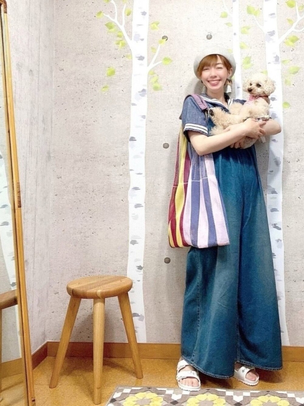 こんにちは! 新しい背景〜✨✨ 白樺〜♫青空〜♫ みぃ〜なぁ〜みぃかぁぜぇ〜♫ って、白樺のウォールシールを貼ってみました。 なんでかっていうと、 この部屋にずっとあるお父さんが撮影した写真が白樺の森で、 お父さんが趣味の写真をはじめて間もなく撮ったものなんです。 この可愛い色合いが好きで(小窓参照) ずっと飾ってあるんです。 子供の頃、庭に植えてあったのも2本の白樺で、 両親が白樺が大きくなったら、そこにハンモックを吊るして昼寝しようとしていたそうなんです。 でも、、 白樺と白樺の間隔が狭すぎて(笑) ハンモックすらかけられない、 小さな頃、私が両手を伸ばしたら両幹に届くくらいの感じでした(笑) そんな思い出いっぱいの白樺(笑) 今日のコーデはオーバーオールLOVE❤️ そして、久しぶりのセーラーカラー✨ この前、衝動買いしたマルチカラーのネットバッグ。 取手のところがしっかりしてて、肩に掛けても痛くない。 衝動買いの割に、すごい良い買い物でした♡ セールだったし。 そして、サンダルも今年初〜♡ ボニしゃんハンドメイドの白いサンダル✨✨ お花のスタッツがめっちゃ可愛い🌸 今年も大活躍間違いなしっ‼️ チャコは冷たい場所を探してはダラダラ過ごしてます(笑) 飽きると、トトトトって私のところに来て 両手でバーンと押してきます。 かまってかまって♫はホント可愛い💗←親バカ