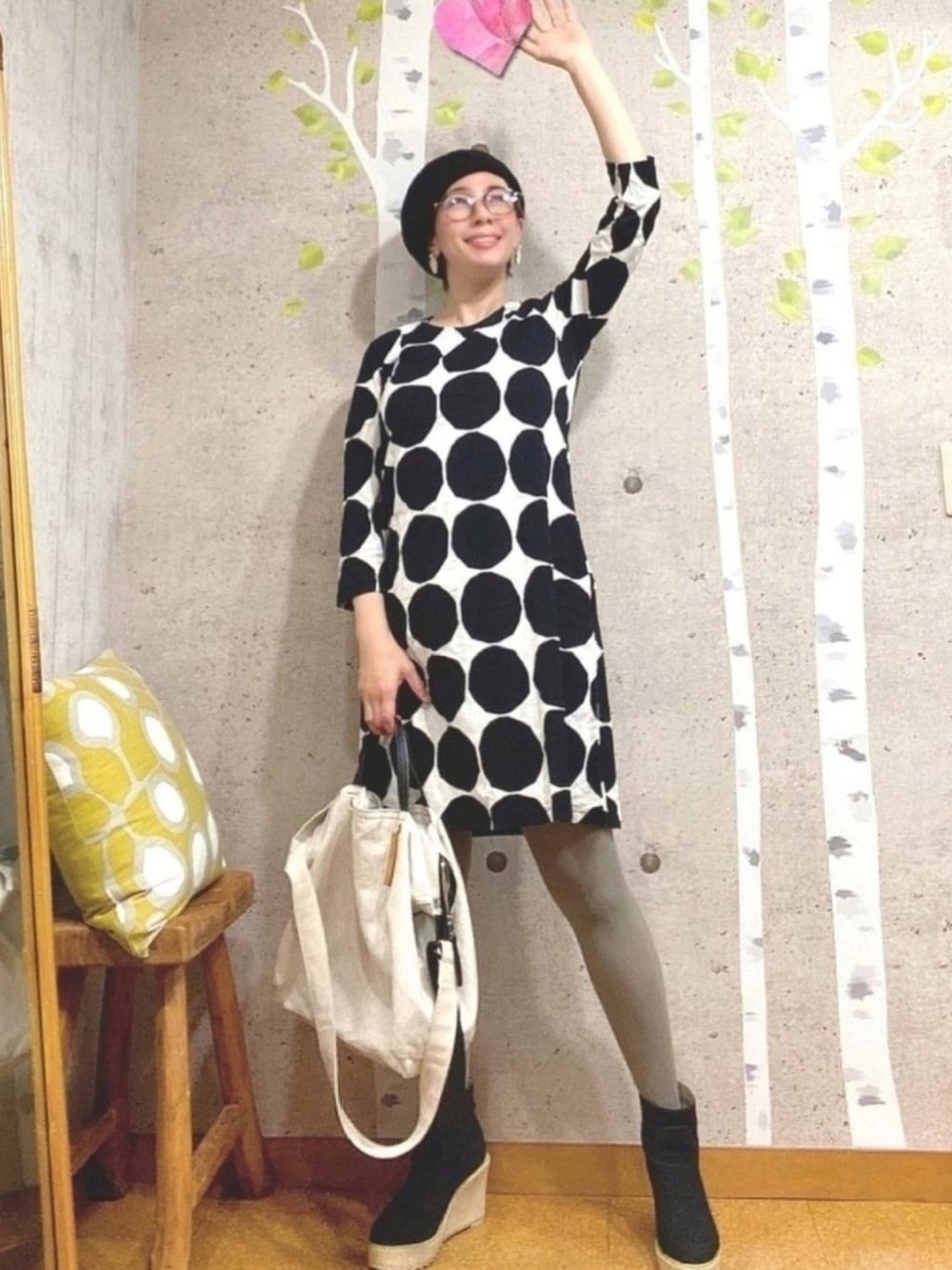 おはようございます! 先日、お友達のbikkoちゃんのモノトーンアタック💗をくらいました!! 破壊力ハンパないかわいさなんだもん💗(小窓参照) 私もアタック返ししないと!!と、 ♡をアタックするところです。 オバオルのモノトーンも考えたのですが、 マリメッコのワンピースにしました。 最近、暑い日が続いていたのでワンピ1枚でも寒くな〜いっ❄️ ほんとにもうすぐ12月⁉️ 一応、我が家の玄関にクリスマスデコレーションしてみたのですが、 暑くて何となくまだ早いかなぁ〜なんて思ったり。 でも、クリスマスツリーはなるべく長く飾りたいからいいよね♫ ツリーは白いもみの木にピンクのデコレーション。 電飾が点灯するとブルーになります✨✨ もう一箇所は、先日、CASICAという古道具や雑貨をを扱うカフェに行った時に、 インドの絵本に一目惚れ💗 一冊ごとに手で刷られているもので、風合いが違うし、 それぞれの木のエピソードが素敵なんです。 絵本の世界を玄関で表現してみました(笑) クリスマスって感じじゃないような、それっぽいようなって感じに見えればいいなぁ。。