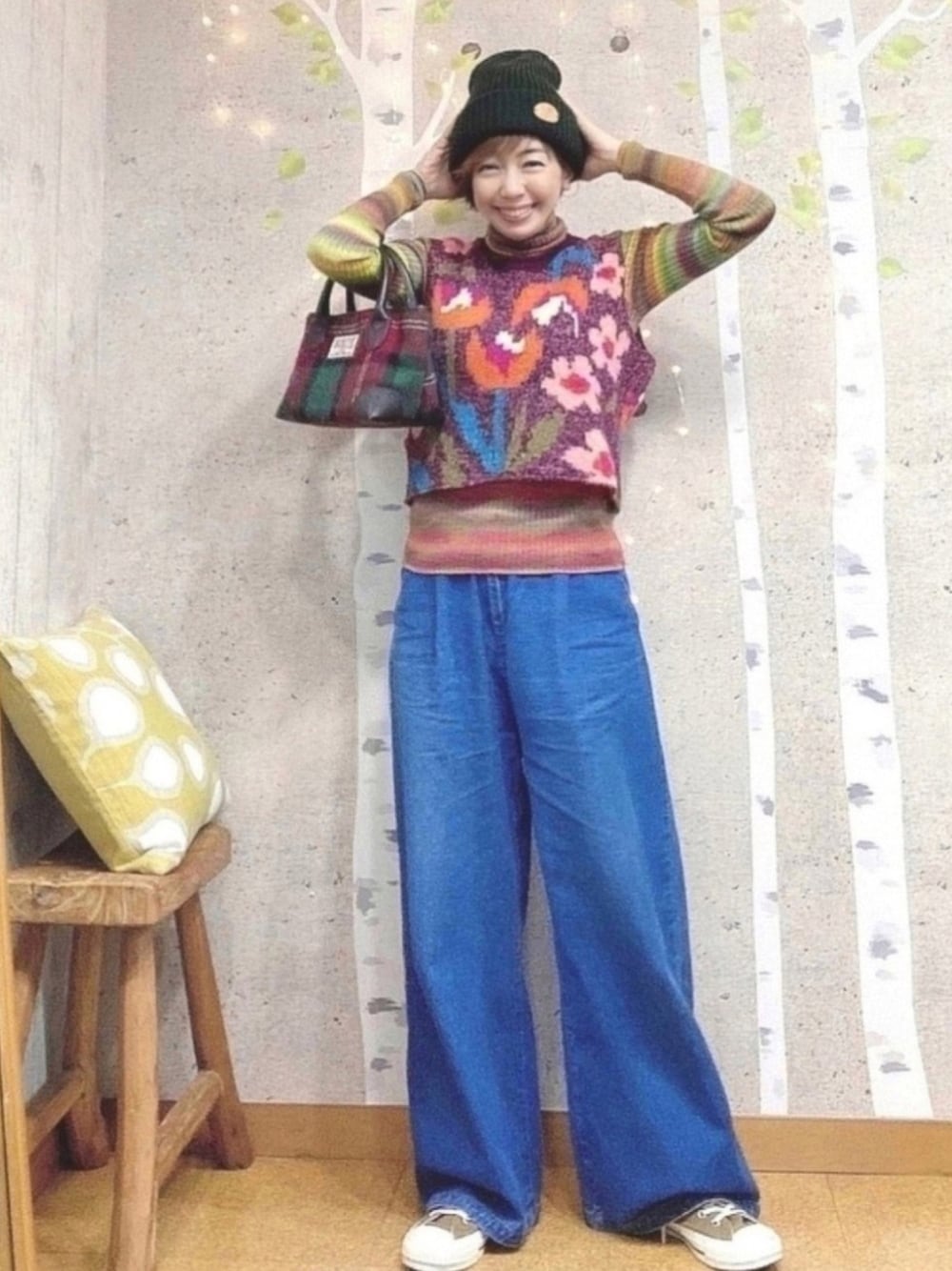 こんばんは! 大好きなツモリチサトのお花ニットシリーズを見つけました✨✨ ピンクベースのベスト♡ 後ろはボタンになってて、多分2wayです。 なかなか出会えないと思ってたから、 うれしい♡うれしい♡うれしいよ〜♡♡♡ せっかくだから同じツモリチサトのマルチボーダーのタートルニットと合わせてみました✨✨ ツモリチサトは昔のものを発掘作業しています。 復刻版もちょいちょい出ていて嬉しいのですが、 辞典のようなツモリチサトさんの本が出ていて、 本には年表があり、この年代にはこのお洋服が作られたとか書いてあり、(小窓参照) それを見てるだけで夢いっぱい✨✨ コーデも斬新✨ やっぱり柄柄合わせ‼️ 真似できんけど、可愛いっ♡ 年表でウキウキするなんて、 戦国時代か幕末かくらいだったのに😂🤣 (それもどーかと、、) Aネット系から離れた時はもうお洋服作らないの?って心配したけど、 独立してファンの為に、量産しないやり方で続けていかれるのを知り、 また素晴らしいなぁと思いました。 量産しては廃棄されるのはお洋服がかわいそう。 流行りが終わったから捨てられるお洋服もしかり。 親から子へ受け継がれるようなお洋服であって欲しい。 なるべく物が捨てられることがなくなれば、 地球温暖化を防ぐこともできるし。 これから先、小さい子達が生きていく世の中が住みやすい世界であって欲しい✨ だからこそ、量産型をやめたツモリさんが大好きだ!!