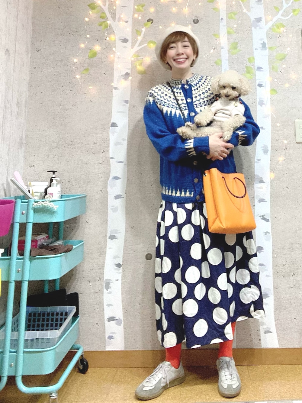 こんばんは! 今日のコーデ💙🧡🤍 数年前にやっと見つけたノルディックカーディガンは、used。 こういう柄物って、なんとなく昔のものの方が可愛いような気がします。←かなり主観。 コレだ‼️と思うまで、とことん探しました。 中のワンピースは、昨年夏に買っていたi am iの。 ずっとアップするタイミングを逃しまくってました。 こちらはカーデとは相反して、 ドットのワンピースを探していた頃。 本当はフランスっぽい、レトロな小さなドットのワンピースを探してました。 が、しかし、 なんでか大きな柄に惹かれちゃう‼️ こんなにデッカいドットな予定ではなかったんですが、 この指が、うっかりポチっとして‼️ もうっ‼️ ってなわけで、購入。 相反する探し方でしたが、どちらもすごく気に入ってます💗 小窓には先日、うっかり早く来すぎたサロンにてお茶しに来てくれたカフェの奥さんと僕ちゃん💗 奥さんは僕ちゃんが生まれてからなかなかカフェにいないので、 おうちから飛んできてくれました✨ 僕ちゃんは今、トーマスが大好き💗テーブルでトーマスを走らせて遊びました。 お気に入りのジェスチャーがあって、それをマネしたら めちゃくちゃ喜んで、そこからはエンドレス!! そのジェスチャーを死ぬほどやりました笑 もう一つの小窓は、施術後はチャコのお散歩タイムでいつもの雑貨屋さんへ行った時の。 赤のベレー帽と、オレンジのバッグを購入した雑貨屋さんです。 チャコのお散歩ルートの一部で、 買いに行くわけではなく(オススメがあると買っちゃうけど)チャコがグイグイお店へ入っていきます。 そして、店長さんに抱っこされるのが日課なんです。 この日は夜遅かったので貸切状態。 チャコとスタッフの皆さんを撮影。 何故か強そうなポーズをとるかわい子ちゃん達。 面白くて、ほんわかして、大好きな空間です。