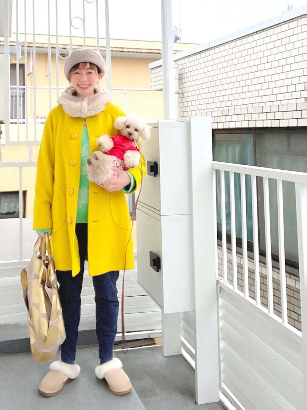 おはようございます! まだまだつづくよ! 足指負傷の為、UGGスリッパコーデ。 こちらは昨日のコーデです。 昨日は雨予報だったので、スリッパコーデは無理かなと思ってました。 でも、出勤する時は雨が降ってなかったのでスリッパにしました。 仕事中はザバザバ雨が降り、 帰りまで降ってるかドキドキしました💦 すると、帰りも雨が上がってスリッパのまま過ごせちゃいました💗 ラッキーでした!✨✨ 暗い雲に負けないよう、鮮やかなマリメッコの黄色いコート💛 中は、10年前くらいに購入した ミントグリーンのモヘアニット💚 ROOS VANDEKERCKHOVE (ルース ヴァンデキャルクホーヴ)。 べルギーのブランドです。 グラフィックアート出身のデザイナーさんなので、柄は幾何学模様と斬新。 大窓2枚目はコートを脱いだバージョン。 チャコもダウンジャケット脱ぎました🧡 sancaのスウェットパンツはテーパードになってて履きやすい!と毎年言ってますね🤣 ちょっと年期入ってきたので大切に履いていきたいなぁ✨と思います。 そして、初バラクラバ!! 上から読んでも、下から読んでも、 キツツキ、トマト、スイス、コネコ、ミナミ、 バラクラバ‼️ モフモフあったかい。 キツツキ、トマト、スイス、コネコ、ミナミ、 バラクラバ‼️笑 バッグとピアスはドットリンク💗 ハルちゃんピアス、使いやすくてヘビロテです✨ ありがとー💗 素敵な日曜日をお過ごしくださいね🌈