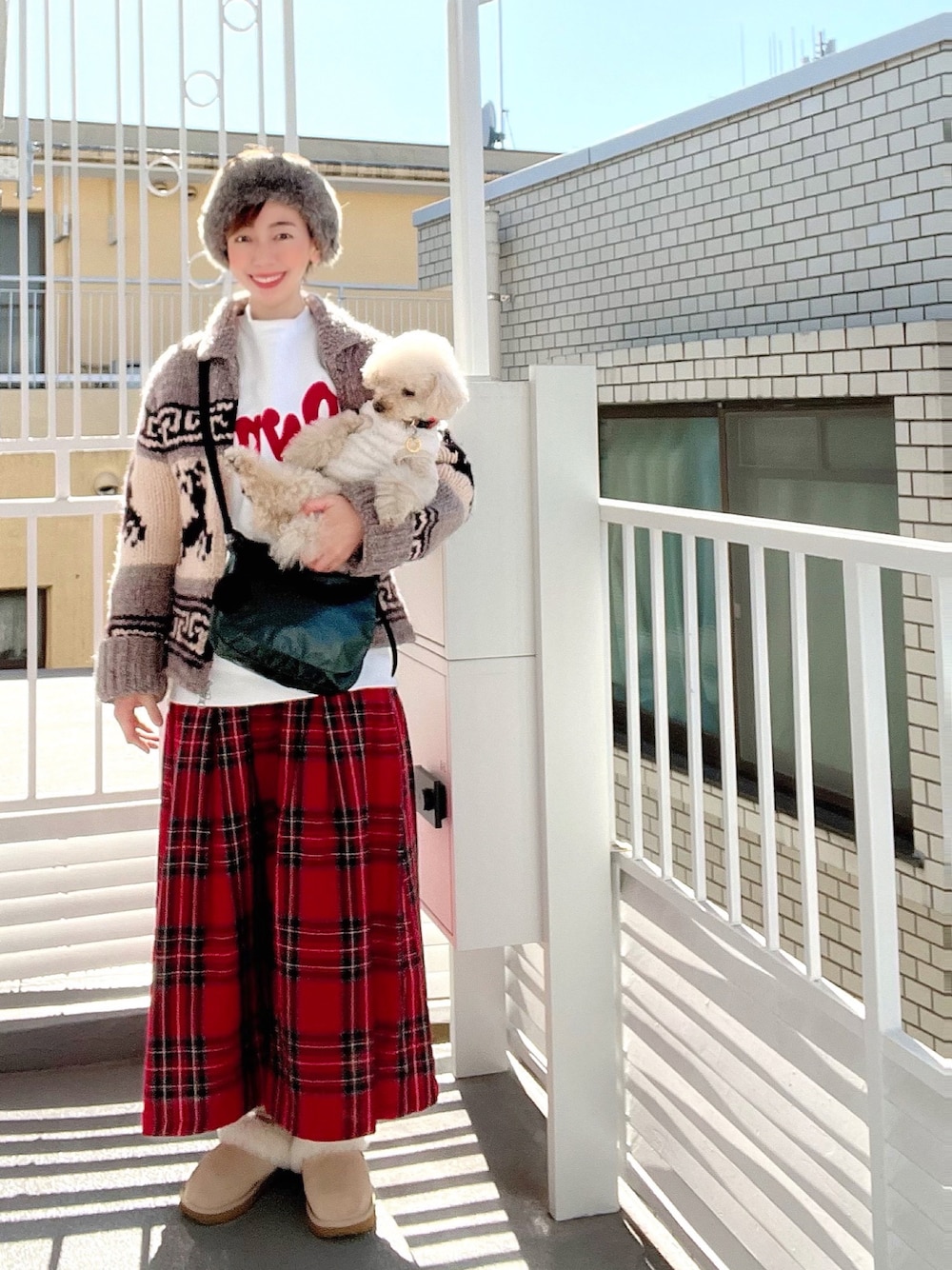 こんにちは! 今コーデです。 足の小指負傷の為、引き続きUGGスリッパからのコーデ続行中!! ツモリチサトのカウチンカーディガンに、 サニークラウドのチェック柄スカートあわせ。 レバニラT、白スウェット重ね!!笑 チャコとリンクコーデしてます🤍❤️ 下のカフェでお茶してたら、横にいたお姉さんと犬猫トークになりました。 ピンクのマーチンブーツを履いたお姉さん、ずんたんに似ていて、 とっても笑顔が素敵な方でした💗 チャコがもたらしてくれる一期一会の幸せなひととき✨✨ コーヒーと一緒に贅沢な時間を過ごせました🥰 先日花柄ニットワンピースにピンクのタイツ合わせしたコーデをタッキーがめっちゃ可愛くしてくれました💗(大窓3枚目) バッグが切り絵みたいだから、私ごとポップアップカードの世界へ!! エッフェル塔をバックにフランスを旅してるみたい✨✨ タッキー、素敵なポストカードをありがとう💗💗💗