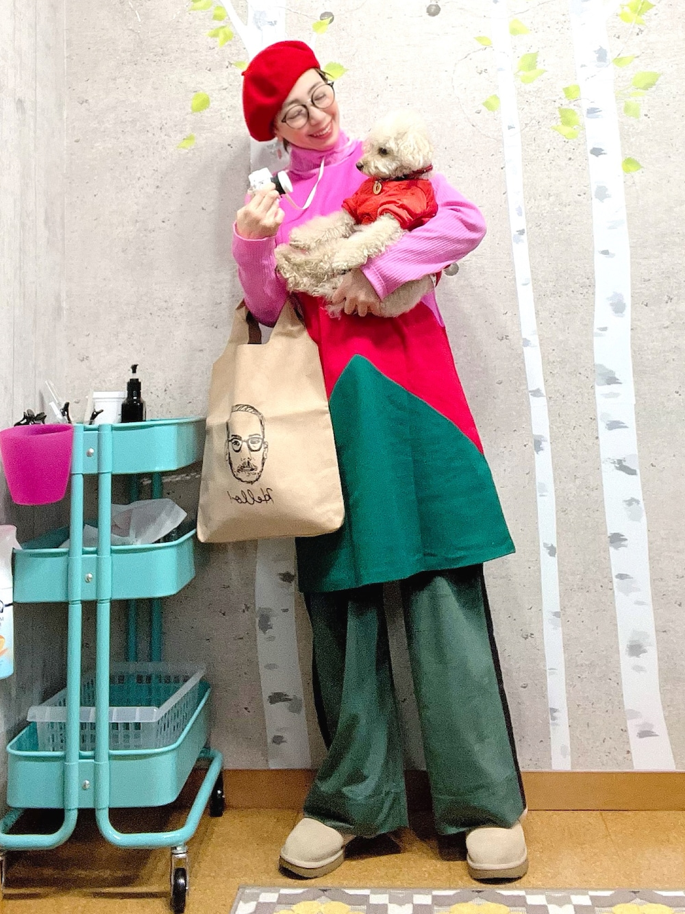 おはようございます! 足指、だいぶ痛みがなくなってきましたが、 UGGスリッパコーデ。 昨日の私。 アニエスbのワンピースで、一度やってみたかったやつ! 上からピンク、赤、緑のカラーリング。 ピンクの延長上にピンクのタートル🤣 緑の裾の延長上に緑のワイドパンツ🤣 真ん中の赤とリンクさせた赤のベレー帽🤣 ついでに、エコバッグのおじさんとメガネリンク🤣 すみません。 随分、遊んでしまっているコーデです。 チャコはカメラを向けると、「ぷい」っと顔を背けます。 それなのに、ポーズがリンクする。 ほんとウチの子はかわいい💗←親バカ 近所のミスドで、鎧塚さんのショコラドーナツを旦那と2人でシェア🍩🍩🍩 軽い食感で、甘過ぎず、大人のドーナッツって感じでした。 トリオレショコラは店員さんのオススメ。 モンブランはドラエモさんが食べてたやつを見て食べたい!と思ってたもの。 ノワドココは旦那セレクト。 さっぱりした甘味なら、トリオレショコラ。 すごく甘党ならノワドココ。 オススメはモンブランでした✨ もちろん、お好み次第💗