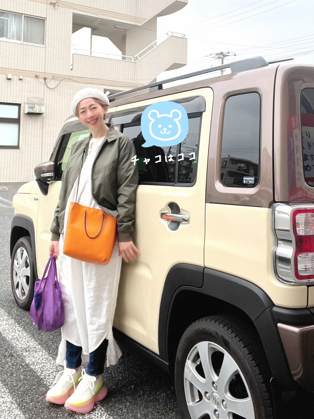 おはようございます! ある晴れた日、先月やってきた新車と撮りました🤣 (車内にチャコがいます🐻) ハスラー好き過ぎて、これで3代目。 今回の色が1番好きかも💗 昨日は1ヶ月点検。 前日の土曜日の夜は旦那と車で夜桜を見にドライブ🌸 亀岡八幡宮、靖国神社、国立劇場などの桜を巡りました。 雨が降っていたけど、 桜が散ってしまう前に見ておきたいと思う人たちが割と多くいました。 色々見たけど、 1番見事に咲いていた桜は自宅の隣にある桜並木でした。 幸せは近くにあるものですね🌸 コーデは、 scyeのスイングトップからコーデしていきました。 スイングトップってかっこいい言い方してますが、 平たく言うとゴルフ用ジャンパーです。 ゴルフ? 一度しかやったことがないですが🤣 それはさておき、 襟のところが犬の耳みたいな形が可愛い💗(そのまんまドッグイヤーカラーというそうです。) 私の好きなラグラン袖だし、動きやすくて楽ちんなところが好きです。 男っぽいトップスにはワンピースを合わせたい💗 面白い靴を合わせたいということでグラウンズを合わせました💗 今回のグラウンズは今までとは違うカタチ。 今日からまた里帰り。 両親の月一メンテです。 実家に施術用ベッドを送ったので快適に施術できてうれしい✨ それとは話が違うのですが、8年近く通って下さってるお客様の彼氏さんの転勤が決まり、 一緒に来て欲しいと言われたとお話ししてくれました💗 遠くなるからウチのサロンに通えるかそれだけが不安と仰ってくださいました🙈💦 彼氏さんの転勤先を聞いたら、なんと‼️ 私の実家の近所🤣 実家に施術ベッドがあると話していたので、 私の実家に行きたい❣️と喜んでくれました✨ ご縁がありすぎてすごい‼️と思うと同時に、 実家の大掃除をしなければと気合いが入りました🤣