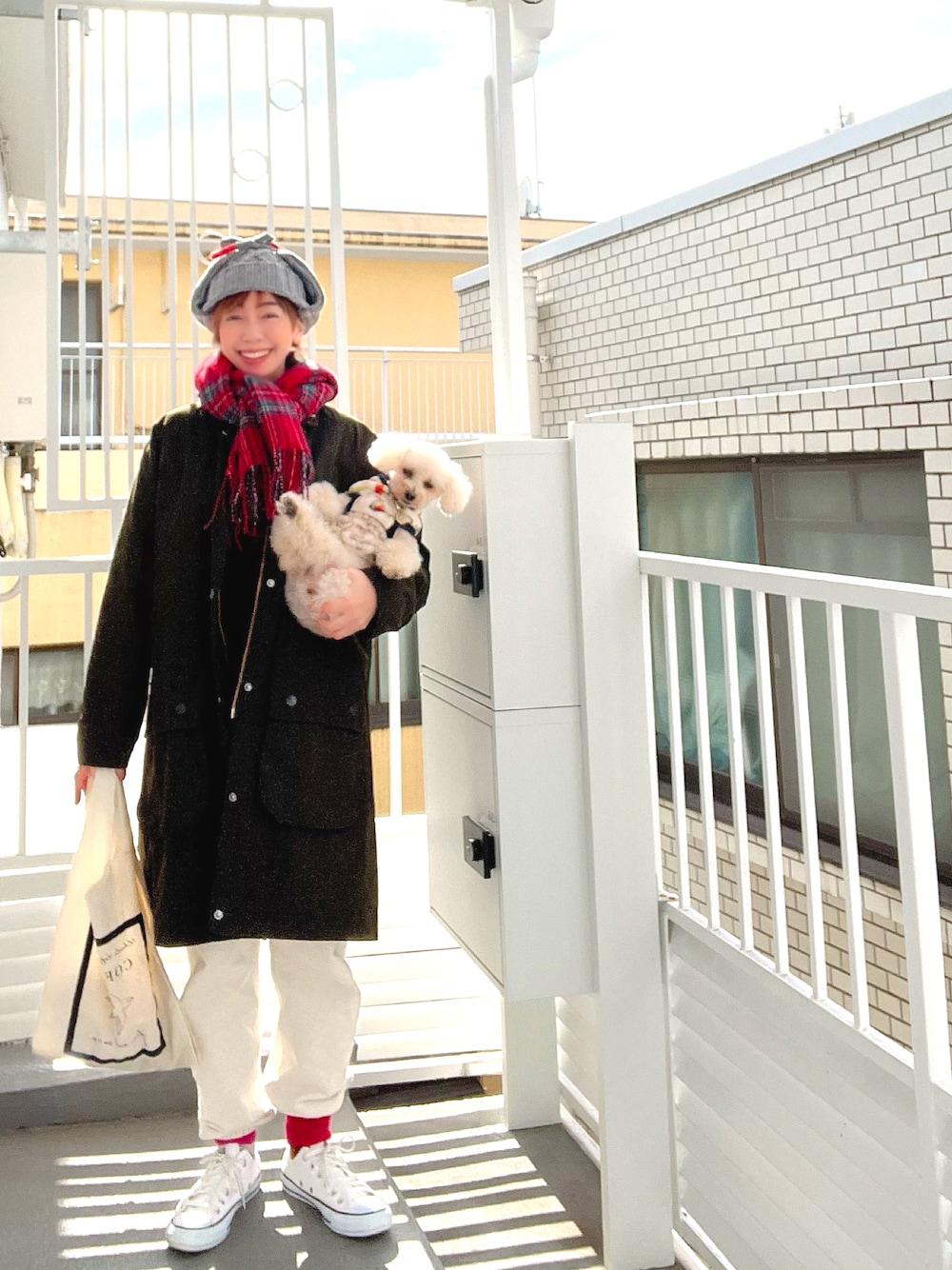 おはようございます! マフラーフェス、何回参加できるかな? まっちゃんよろしくお願いします✨ 前回より少し寒さが増したので、マフラー巻き巻きできました🧣 ビームスボーイの赤チェック柄マフラー。 バブアーのAラインコート。 写真では全くAラインに見えず。(小窓参照) このくらいの寒さにピッタリ✨ 真冬になるまで、たくさん着たいコートです‼️ SNOW PEAKのスウェットパンツの中に、左右色が違う(❤️×🩷)レギンス。 レギンスが温かくて、何かと履いてます。 だるちゃんとお揃いのフラボアのニットのフライトキャップ。 今年も活躍しそうです🩷 コートの中はネイビーのレバニラスウェットです💙 ロゴがカクカクしてるバージョンです。 昨年、文字の指定を間違えて注文したものですが結果的に気に入ってます。(小窓にもない🤣←扱いがザツなのに気に入ってるという私。) 今日から新しいお弟子さんがやってきます。 なんと‼️初の男子‼️ しかも、元プロボクサーです🥊 お客様の旦那様なので、毎回お客様のセットでいらっしゃって、 お客様をモデルに施術を覚えてもらう感じです。 先週、見学に来られたのですが、 温和な子煩悩パパさんで、チャコもめちゃくちゃ懐いてました。 チャコがオッケーなら大丈夫かな⁉️ なんと言っても、体幹がしっかりしてるし拳もしっかりしてる(当たり前🤣)‼️ 最速デビューも夢じゃないのかな⁉️ いつもと勝手が違うので緊張しますが育て上げたいと思います👊