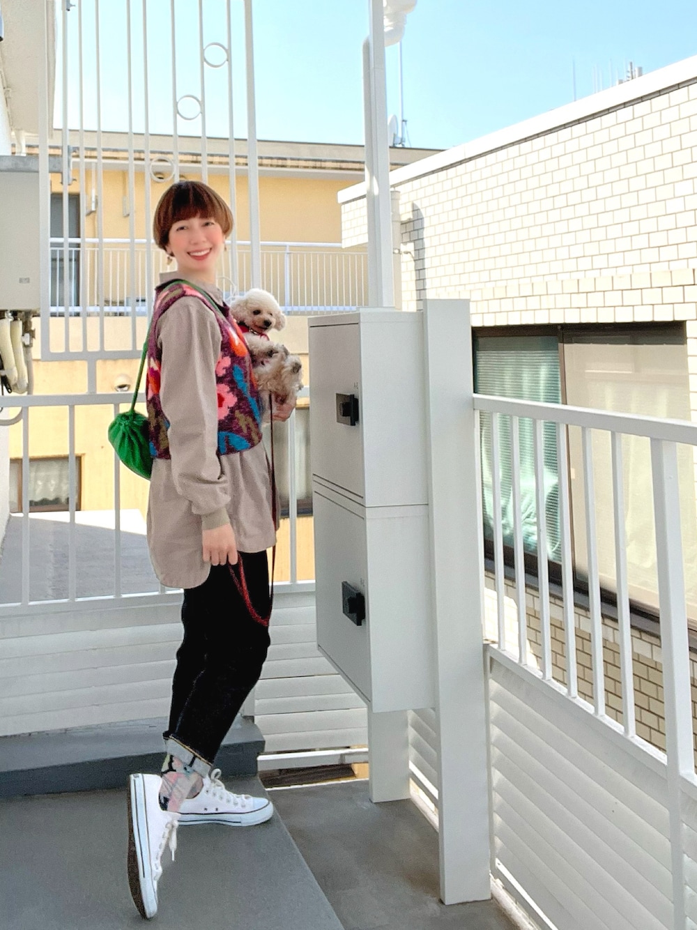 おはようございます! ちょっと寝不足の日コーデ。 前日、深夜までうたた寝して起きたらテレビでめっちゃシュールな映像が流れてました。 「おやすみタローマン」。(小窓参照) って、なに⁉️ ウルトラマンと太陽の塔がドッキングした姿のタローマンが 眠りを誘うBGMと共にひたすら前衛的な動きをしてる。 なにこれ?🤣🤣🤣 妙にツボにハマって結局最後まで観てしまいました。 やるなぁ、NHK。 コーデは、 ツモリチサトの花柄ベストからのコーデ。 この花柄が好き過ぎて一時期スマホの待受にしたくらい好き🌸 このシリーズが好きで好きで、数年かけてスカート、カーディガン、ワンピースと全コンプリートしました。 当初発売されたリアルな時代では若過ぎて到底買えなかったので 気軽に探せて、しかもリアルで売られていた時よりも安く買えてしまう時代に感謝します。 ベストの花柄の中の葉っぱのグリーンを拾って、 マリメッコのピーマンぽい斜め掛けバッグ🫑 グリーンと花柄も入ってるトイプードル靴下。 ビオラのピアスにしました。 パッと見、地味め。 でも、ベストのおかげで実は華やかにみえるコーデです。 今日の夜から旦那はスキーに行くので、私は自由が丘のサロンにチャコとお泊まりです。 合宿気分の週末🎵