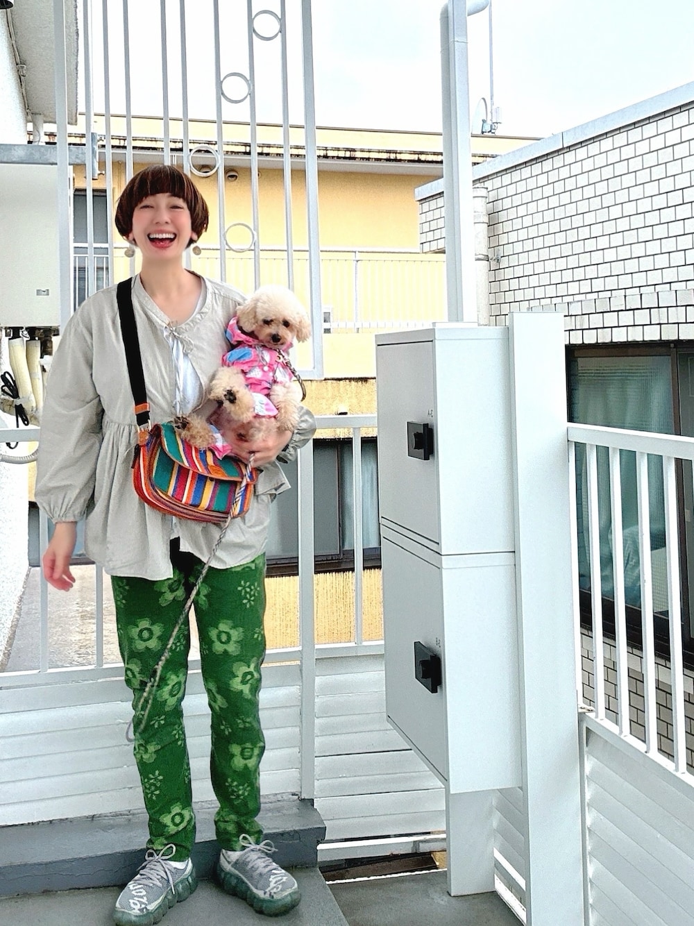 というブランド名のモンペ❣️ 花柄がかわいいでしょ❓🌸 毎年欲しくなっちゃうこのモンペシリーズ。 今年は私がのんびりし過ぎててお目当てのモンペは既にSOLDOUTでした。 それもご縁! 今回のコーデ。 トップスの羽織りの方は岡山県倉敷市のブロカントというブランドです。 2wayの着方ができます。 今回は前側に紐で結ぶバージョンにしました。 中に着てるのは、オーシバル。 襟と裾にギャザーが入っててオーシバルにしては珍しいデザインです。 どちらもGOOD DEALで購入。 結婚後、やっと好きな雰囲気のお店に出会えたセレクトショップです😊 ずっとお世話になっていたのですが、 来月7月で閉店することになってしまいめちゃくちゃショックなんです💦 このお店を好きになったキッカケの店員さんが別店舗から戻って来ていて 久しぶりに小1時間くらいおしゃべりしてきました。 感謝と、激励と、とにかく元気になって欲しくて。 この素晴らしい接客を受けられないことがどんなに悲しいか。 はじまりがあれば終わりは来る。 どんなものでもそれはあって、 人も、動物も、お店も、物も、例えば番組だって、終わりに向かって走っている。 ゴールテープをどう切るかはそれまでの走ってきた経緯次第。 間違いなくGOOD DEALは味のある走り方で魅了したショップだと思います✨✨ まだあと1ヶ月あるので、ありがとうはその時までとっておこうと思います💗 梅雨入りして雨。 チャコはピンクのカッパ💗 私はきのこカットしてもらってスッキリ🍄✨