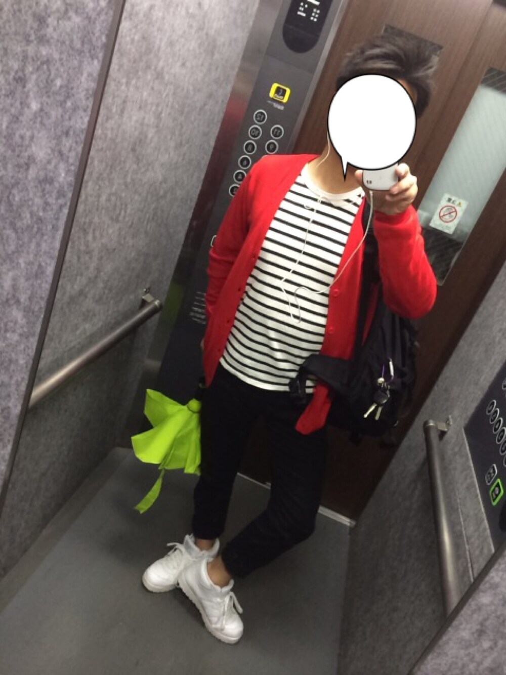 新茶祭😋 まだ間に合うかな💦 赤カーディガン × ボーダー × 何故か ライトグリーンの折りたたみ傘