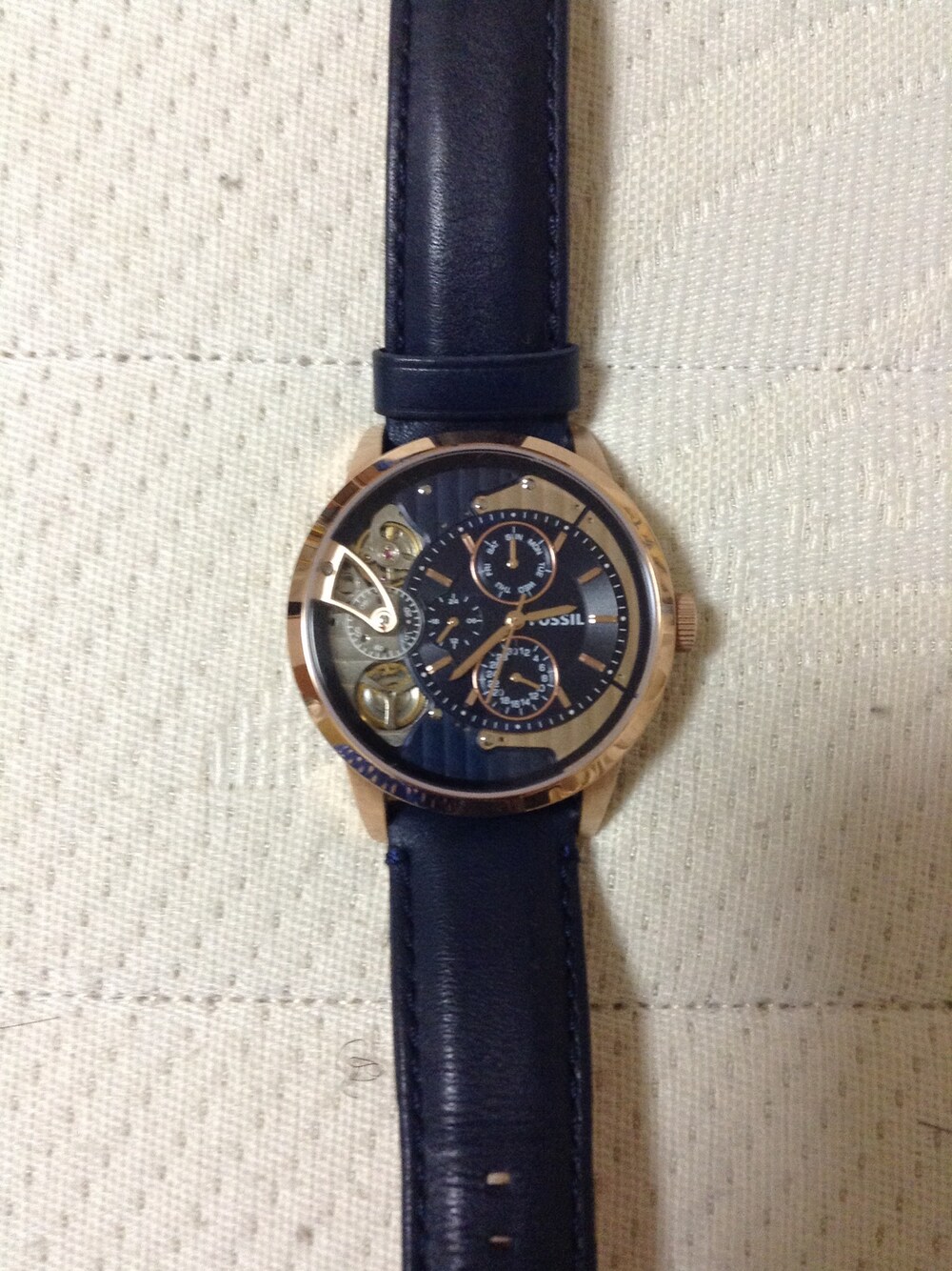 ブルー系のアナログ腕時計を着用したメンズの冬コーディネートの1枚目の写真