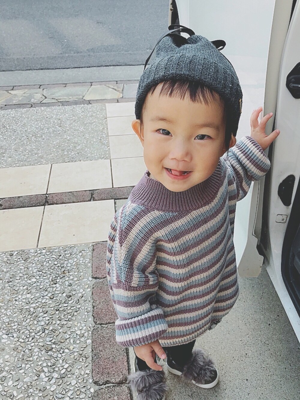 この間と変わらないコーデ🤣 可愛いニット帽を被ってくれたから、記念に❤️ 今日は動物園に行って、沢山の動物と触れ合ってきたよ♫ ライオンが吠えてて、ビックリしたり🦁 お猿さんの赤ちゃんが小さくて、可愛い〜と叫んだり❤️ ヒトが居たり(笑) ふーちゃんの成長を感じました😊 ニット帽被ると、前髪映えるな(笑)