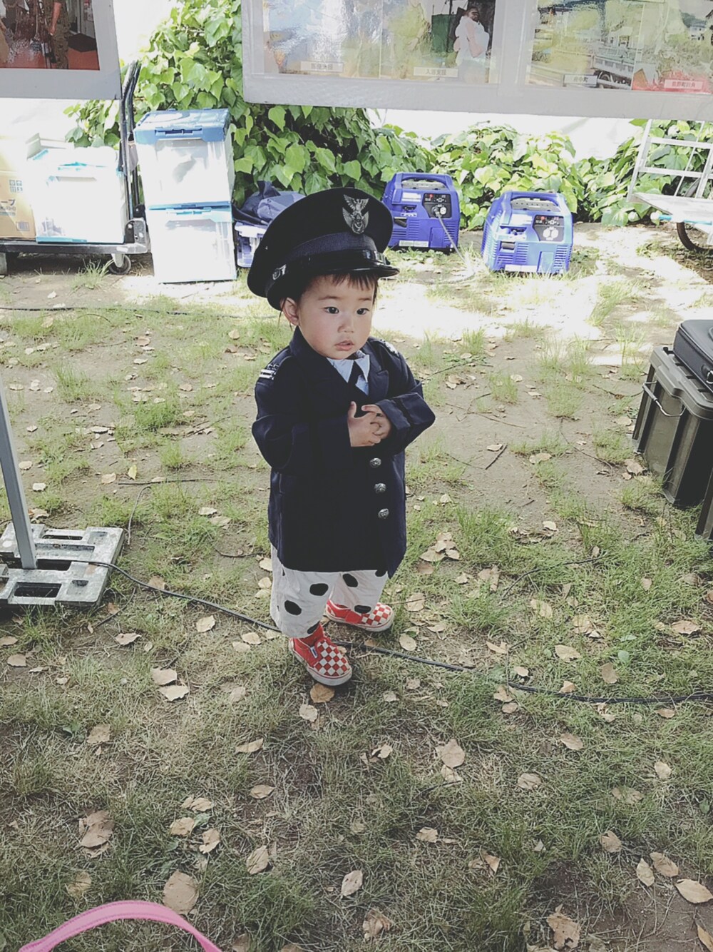 自衛隊体験〜 写真撮ってもらい、缶バッチに❤️ 緊張気味なふーちゃん(笑) ぽぽさんは、嫌だと😭 二人のが欲しかったのになー。