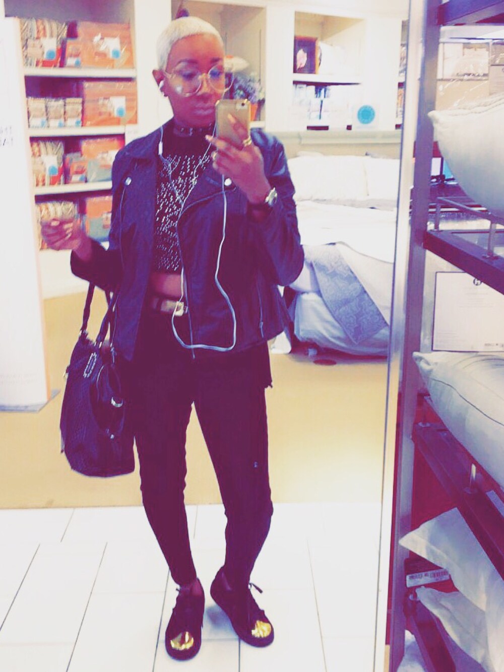 ゴールド系のその他シューズ、ブラック系のジャケット/アウターを着用したレディースの春コーディネートの1枚目の写真