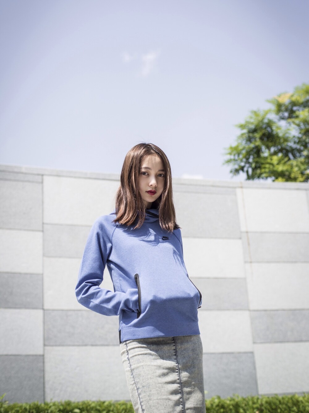 ブルー系のパーカーを着用したレディースの秋コーディネートの1枚目の写真