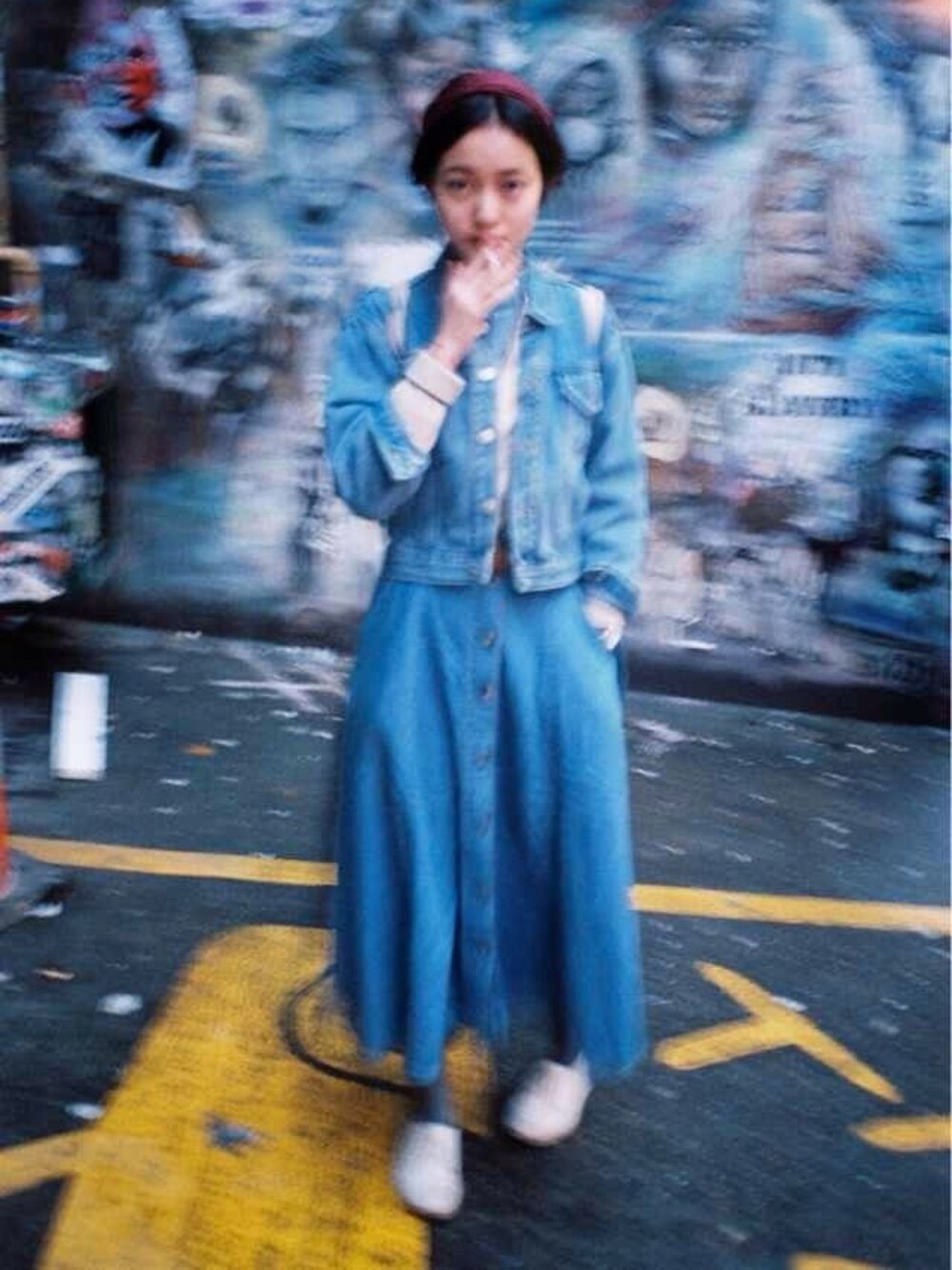 ブルー系のデニムジャケット、ブルー系のデニムスカートを着用したレディースの秋コーディネートの1枚目の写真