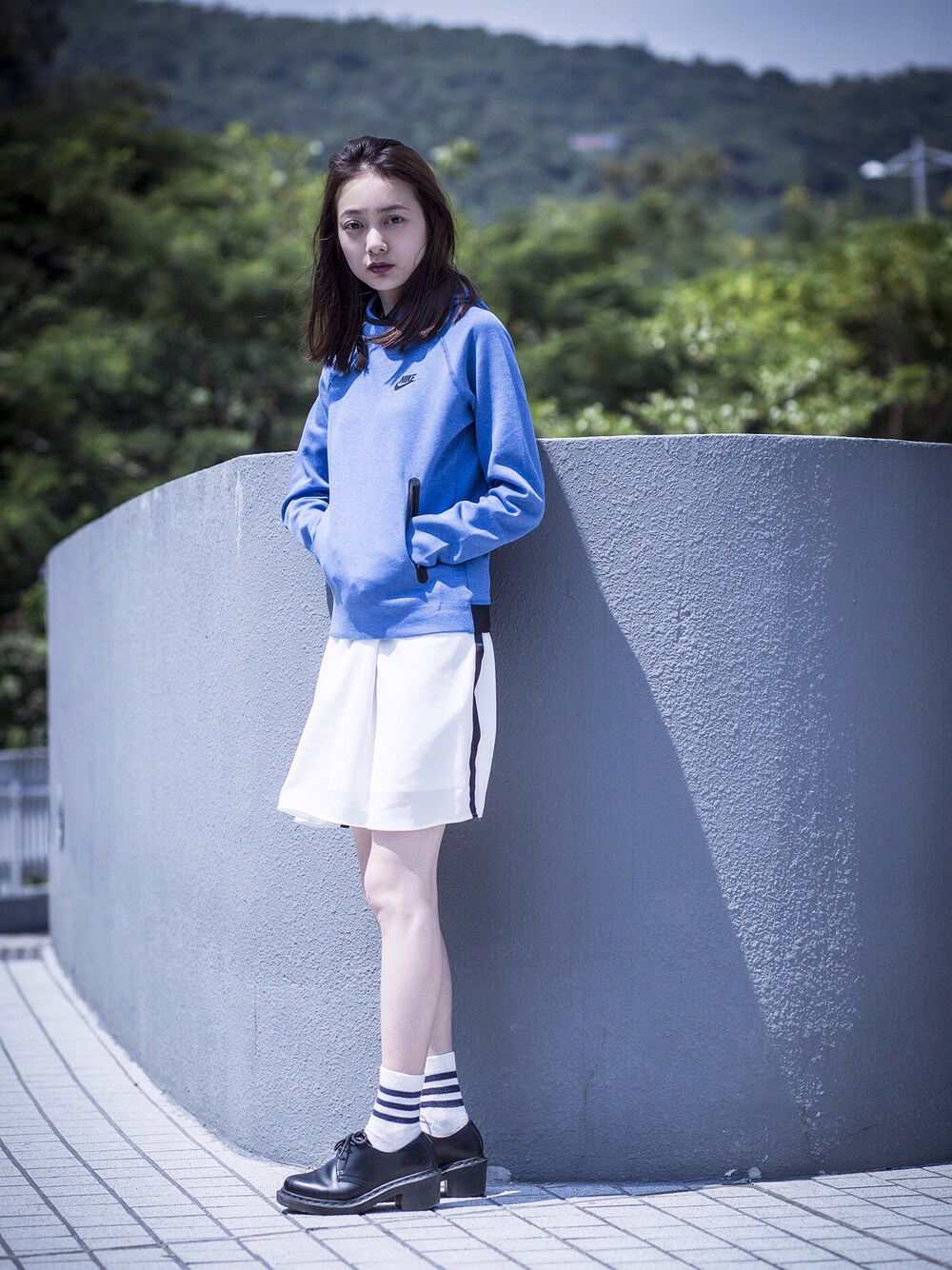 ブルー系のパーカー、ブラック系のその他シューズを着用したレディースの秋コーディネートの1枚目の写真