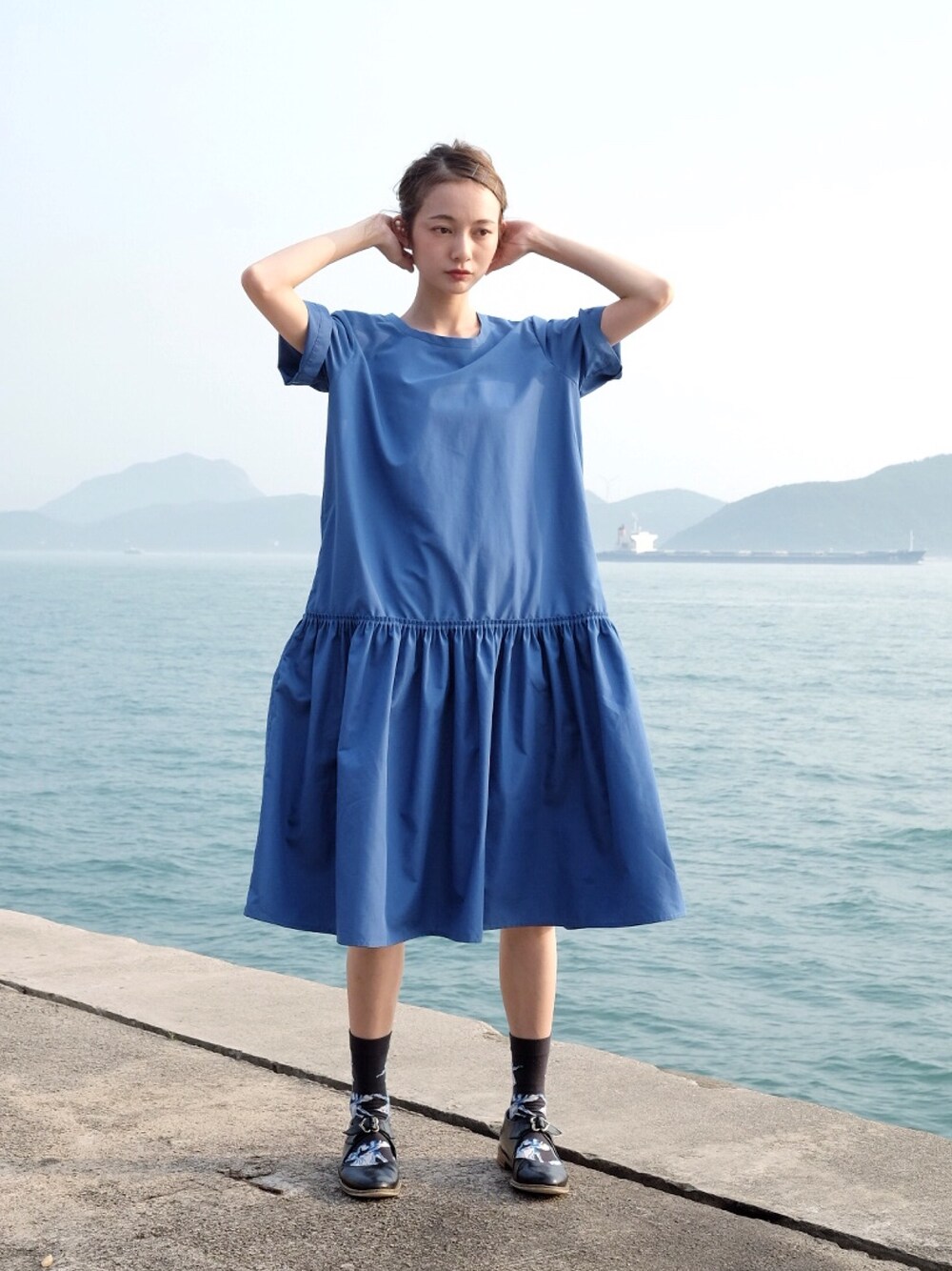 ブルー系のワンピースを着用したレディースの秋コーディネートの1枚目の写真