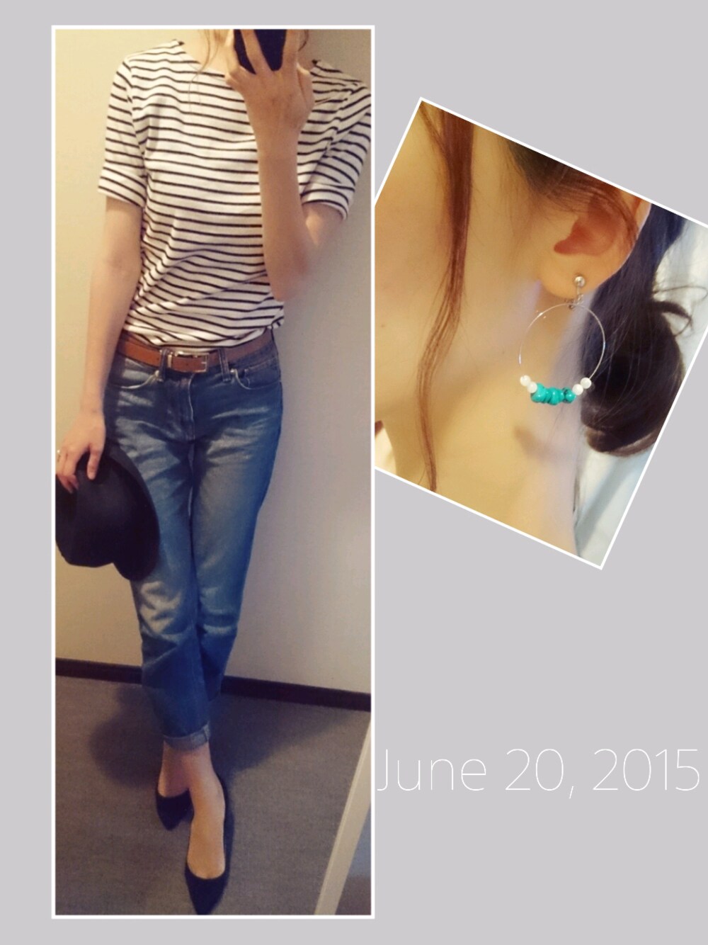 おもいっきりカジュアルな日! ヒール×イヤリングで妻モードも忘れないように! 手作りアクセサリー1号は、ずっと欲しかったターコイズ系フープイヤリングです(*^O^*) 次はお揃いのネックレス作る予定(^3^)/ GUメンズで可愛いハットとサンダル発見! ほしいなー⊂(^(工)^)⊃