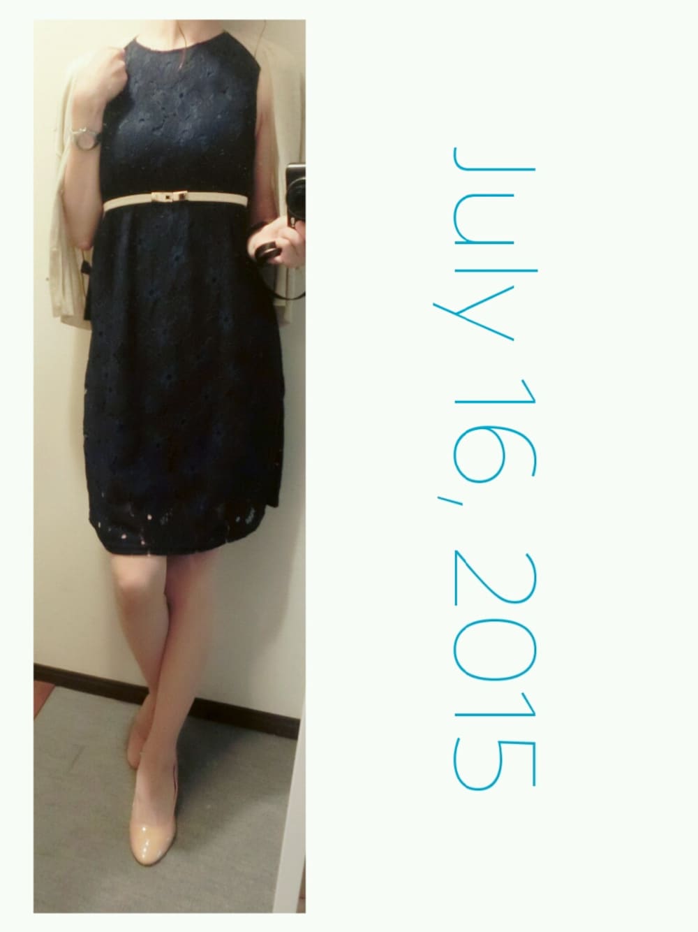 雨の日。 自転車使えないので、電車通勤です。 電車の日はスカートでも気にならないので ちょっとお上品系にしてみました。 以前結婚式に着ていったレースワンピに ウエストマークのベルトとカーディガン。 朝から送迎ばったばたで汗まみれになったので アクセサリーはなし!になりました。