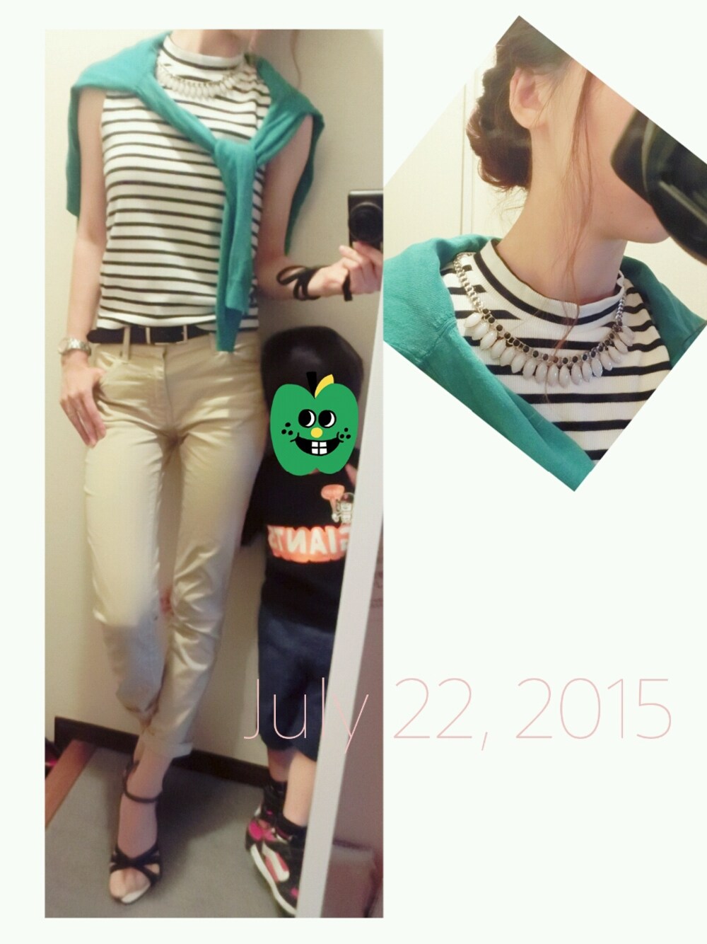 むすこが割り込み。 僕も撮ってー!だそうです。 またまたnewアイテム、グリーンのカーデです。 ネックレスはGUで280円。 買いすぎちゃったかな。