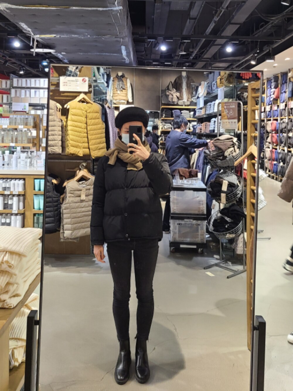 ブラック系のデニムパンツを着用したレディースの冬コーディネートの1枚目の写真