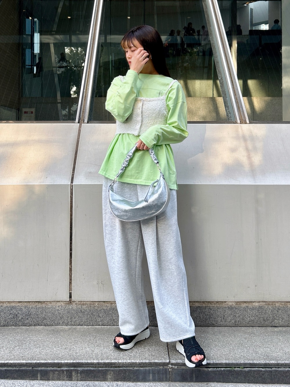 爽やかなライムグリーン🍋🟩 ロンT×ビスチェがさくっとおしゃれに見えてお気に入り🐰🤍 スウェットパンツは形が優勝 ストーンが付いてるタイプも可愛いなぁ💭 ゆるっとコーデにはメタリックバッグをプラスして♪ ダル着感なく着こなせます!