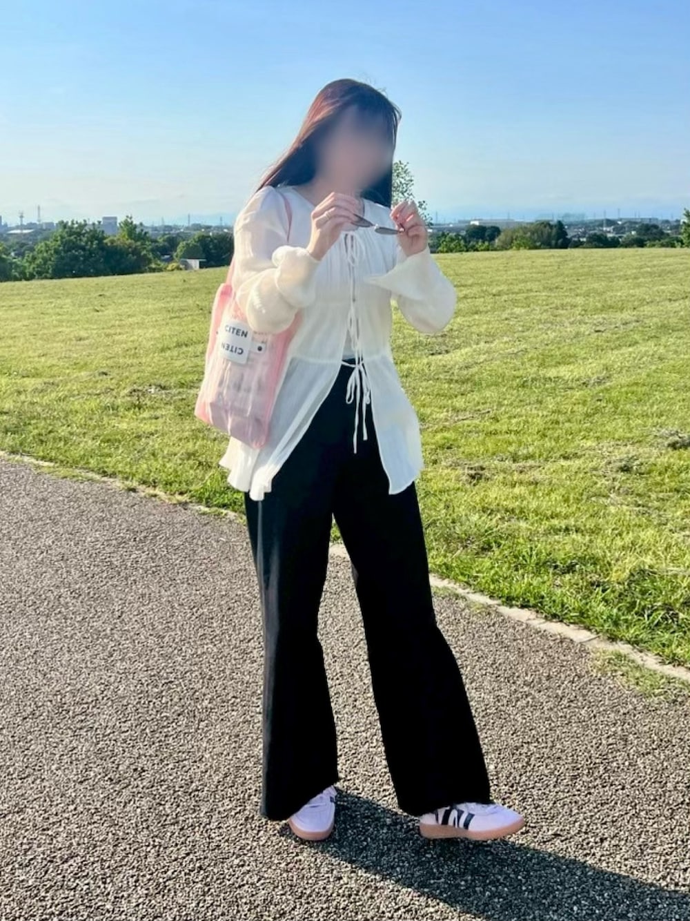 天気が良くてピクニックした日☀️ ピンク小物×ブラックワイドパンツ🩰🐼🖤 お気に入りコーデです