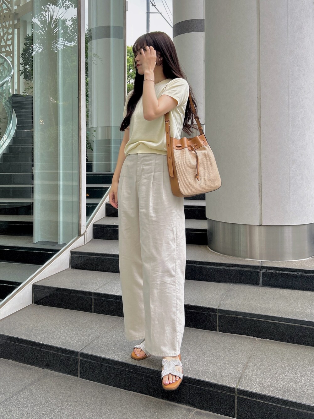 色味と素材でほわっと可愛く! ほんのりイエローのサマーニットは なんとUVカット仕様👏🏻 巾着っぽなショルダーバッグが 可愛さを底上げしてくれます✨👜