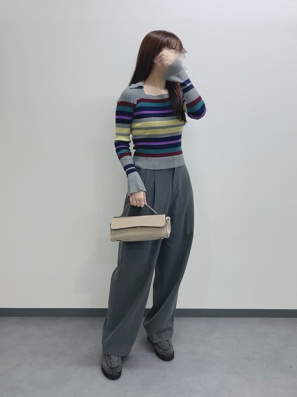 グレーでトーンを合わせたくすみコーデ カラフルなボーダーニットをアクセントに🙌🏻 シューズは、毛足の長いふわふわスエードで あまりみたことない珍しいタイプで人とも被らずおしゃれでおすすめ🥺❤️🔥 写真では伝わりきらない...本物はもっと可愛いです! 柔らかい本革で足馴染みもgood🙆♀️✨