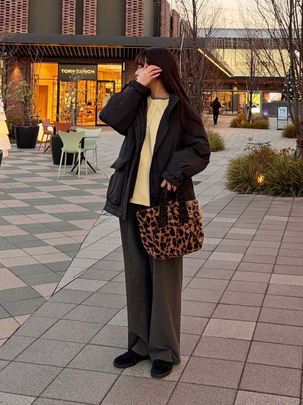 アウトレットに行った日! 屋外のお買い物は寒い~... お店はあったかいから 手持ちしやすい軽いコートがマスト💛 レオパードのふわふわバッグは フリルハンドルで甘さON