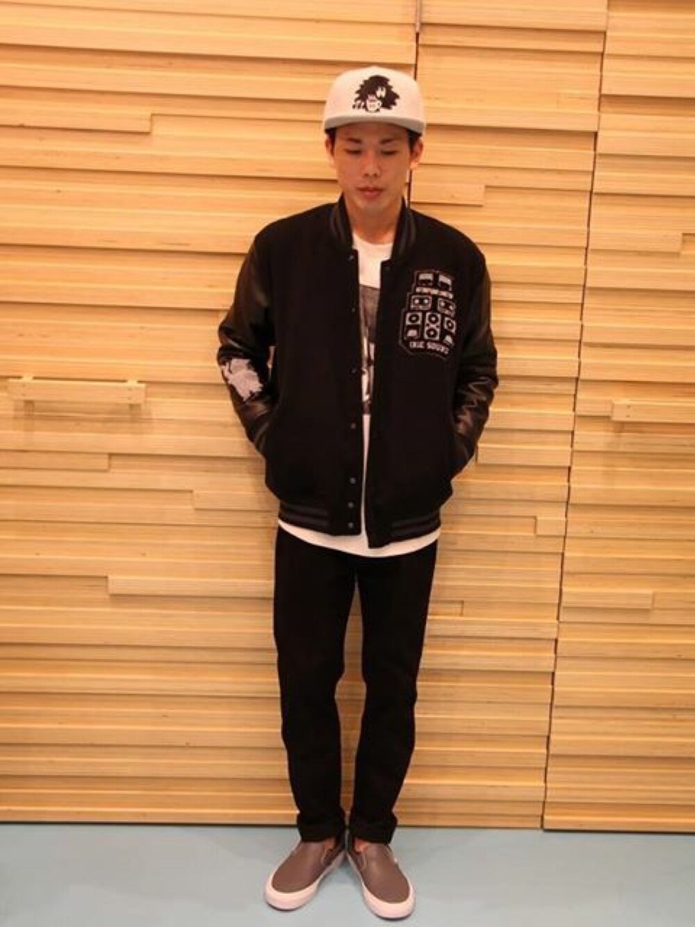 おすすめアイテムの IRIE SOUND STUDIUM JACKETを取り入れたSTYLING! ブラック中心としたかっこよさの中に、JACKETの腕のサガラワッペンを使用したPOW KINGと、横浜を代表するアーティスト"KIRARIN"による、優しいタッチのCREW,CAPのデザインが目を引きます! 流行りのスキニーパンツと合わせて、今年の冬バッチリのコーディネートです!