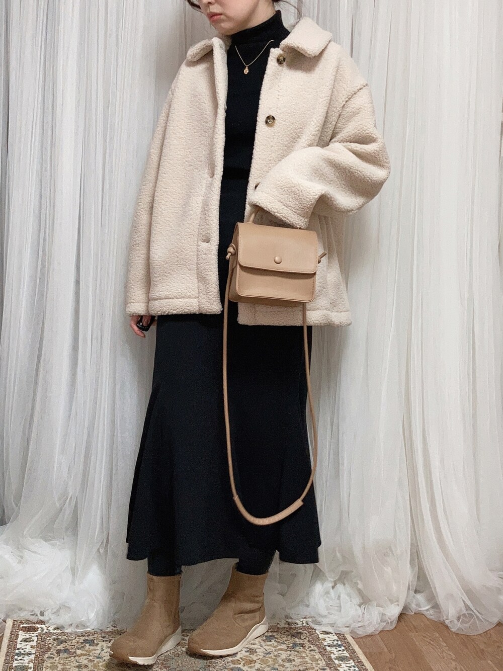 コートの下はブラックで統一してしっとりと大人っぽく。 白のボアコートてふんわりとした女性らしさを☺️