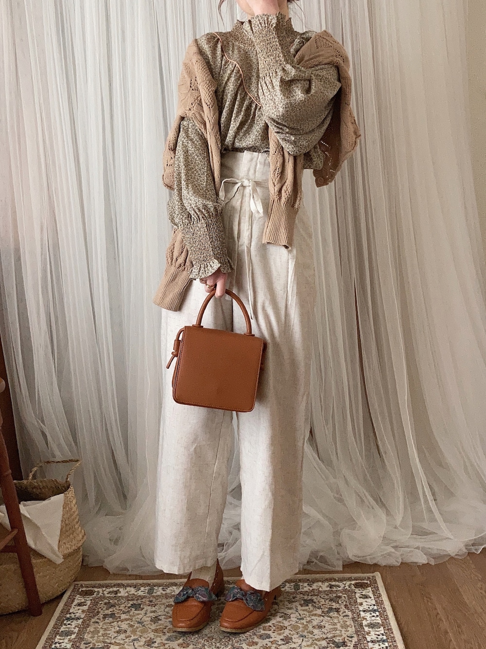 ひとめぼれしたBabさんのブラウス💐 2way仕様でどちらで着てもとっても可愛いのだけど 今回はくるみボタンはバックスタイルに🥰 パイピングのサーモンピンクがとってもお気に入りです🥺💘 海外の女の子みたいな雰囲気があるブラウス🥳 全体的に甘いので、カジュアルなbrownで小物はあわせました🤝🧸