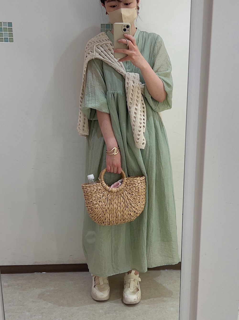 暑くなってきたのでシアーのワンピースで涼しげに🎐.* あみあみカーデはポイントに肩掛けにしました🫶🏼 あみあみ、幼子がいるとなかなか着にくいなぁ、と思って出番無かったけど この使い方ならまたすこし使えそう🤫