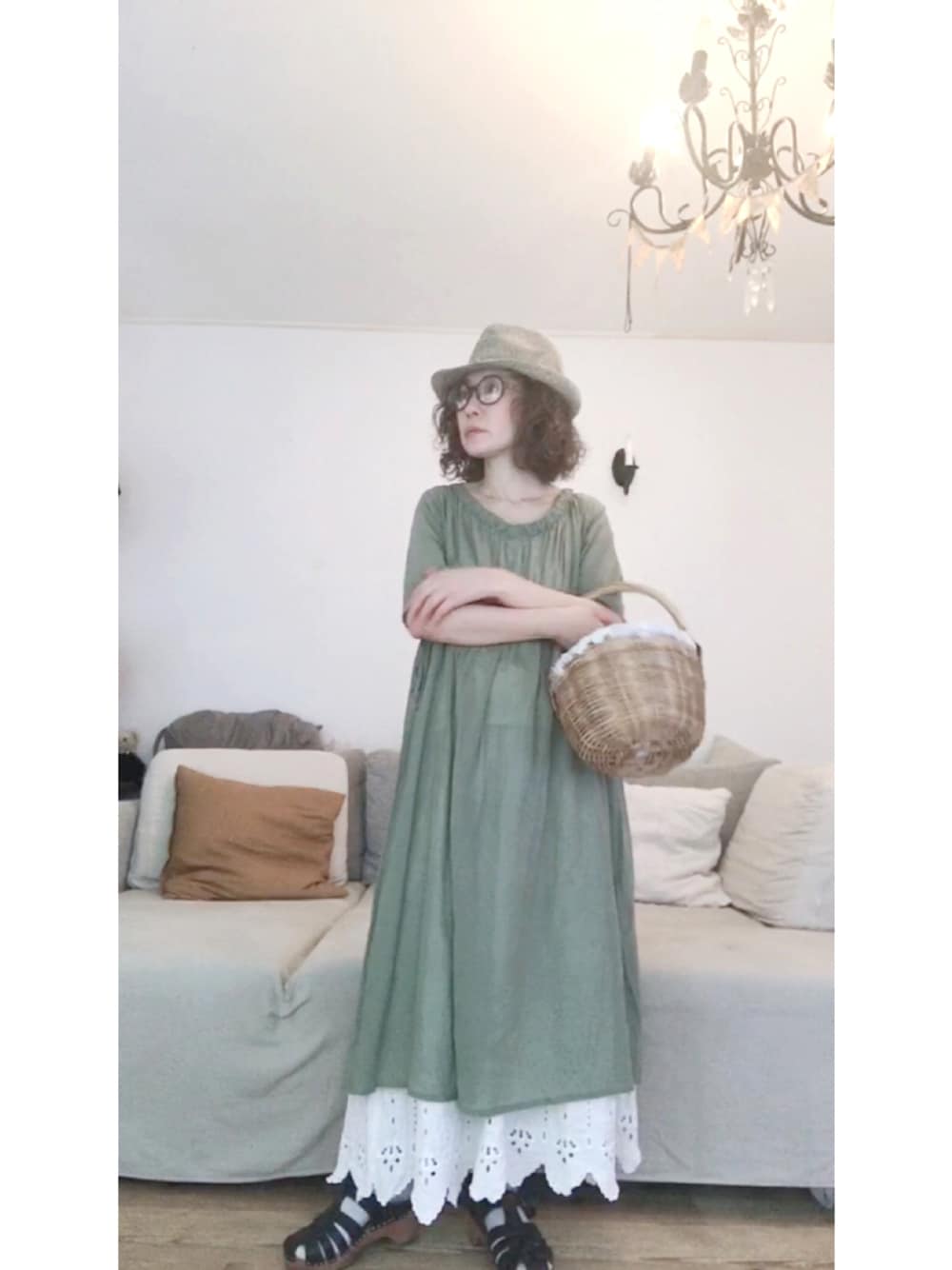 こんにちは☺︎ ご覧くださりありがとうございます♪ 今日はモスグリーンのワンピースに合わせてコーディネート組みました。 昔のワンピなので、ちょっと短め。 下にも長いスカート履きました。 レース部分が覗くので可愛いです😍