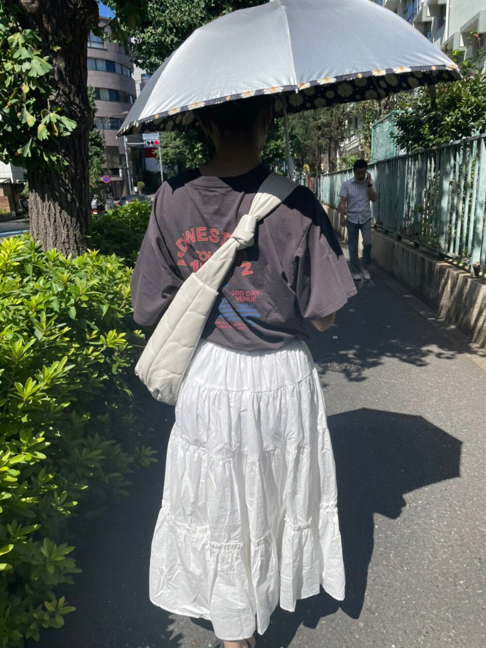 Tシャツとフリルスカートでカジュアルに🍃 秋に入ったみたいだけど暑い日が続きますね🌰☀️(暑くてレモネード飲んじゃいました🍋)
