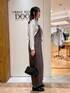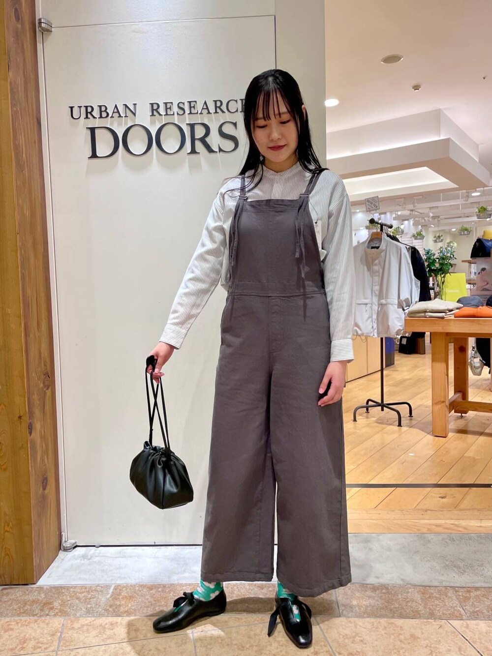 コットンバッククロスサロペットをメインに組んだコーディネートです! 引きの画だと分かりづらいかもしれませんが、中に着たダブルクロスバンドカラーシャツのストライプとサロペットの色をリンクさせています。 この日は靴下が派手だったのでこんな感じになりましたが、リボンシューズは靴下の合わせ方によっても沢山楽しめそうです☺️🧦